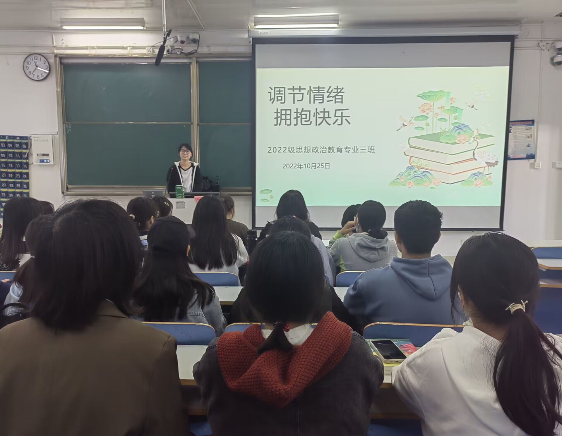 为深入推动大学生心理健康教育,引导大学生积极主动地关注自身心理健康,10月25日上午,太阳集团tyc59972022级思想政治教育三班在社科楼514教室召开“调节情绪,拥抱快乐”主题班会。我院2022级思想政治教育三班全体成员共同参加会议,班会由心理委员张韶涵主持。