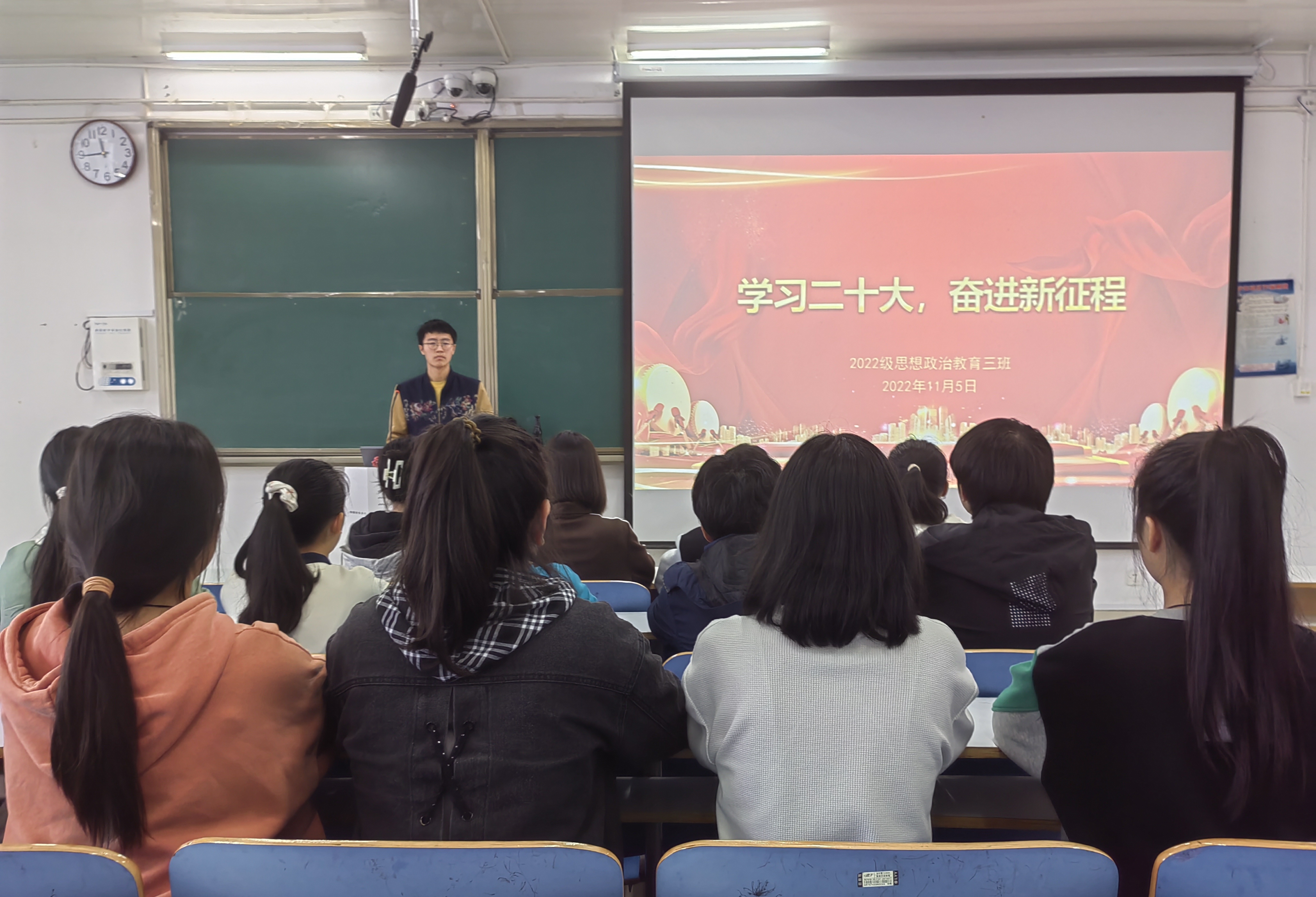 学习新思想,迈进新征程。为全面学习贯彻党的二十大会议精神,11月5日上午,太阳集团tyc59972022级思想政治教育三班在社科楼514教室召开“学习二十大,奋进新征程”主题团课。2022级思想政治教育三班全体成员共同参与团课,团课由团支书余浩洋主持。