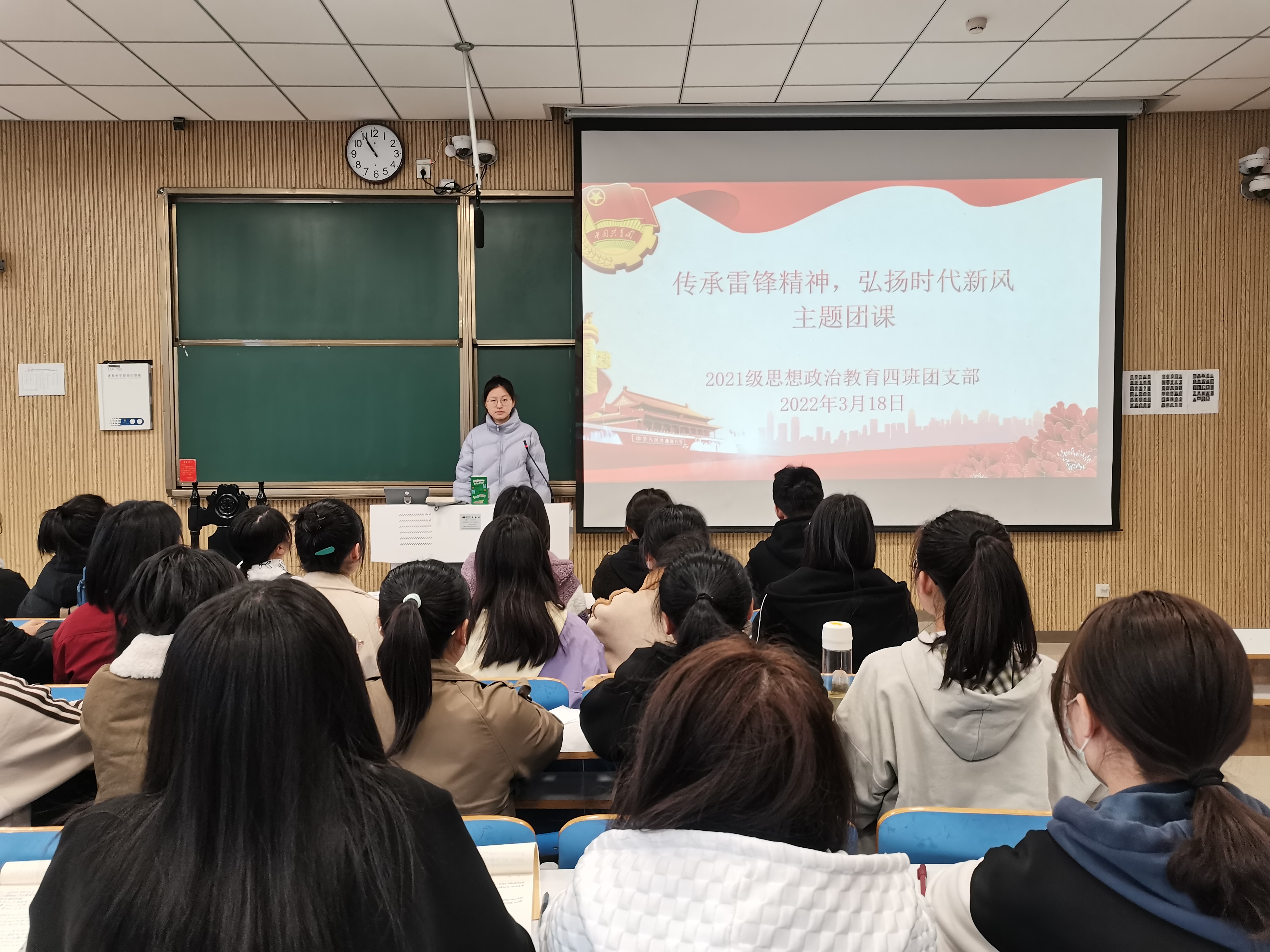3月18日上午,太阳集团tyc59972021级思想政治教育四班在社科楼515教室开展“传承雷锋精神,弘扬时代新风”主题团课。2021级思想政治教育四班全体团员共同参与本次团课。团课由团支书刘珂含主持。