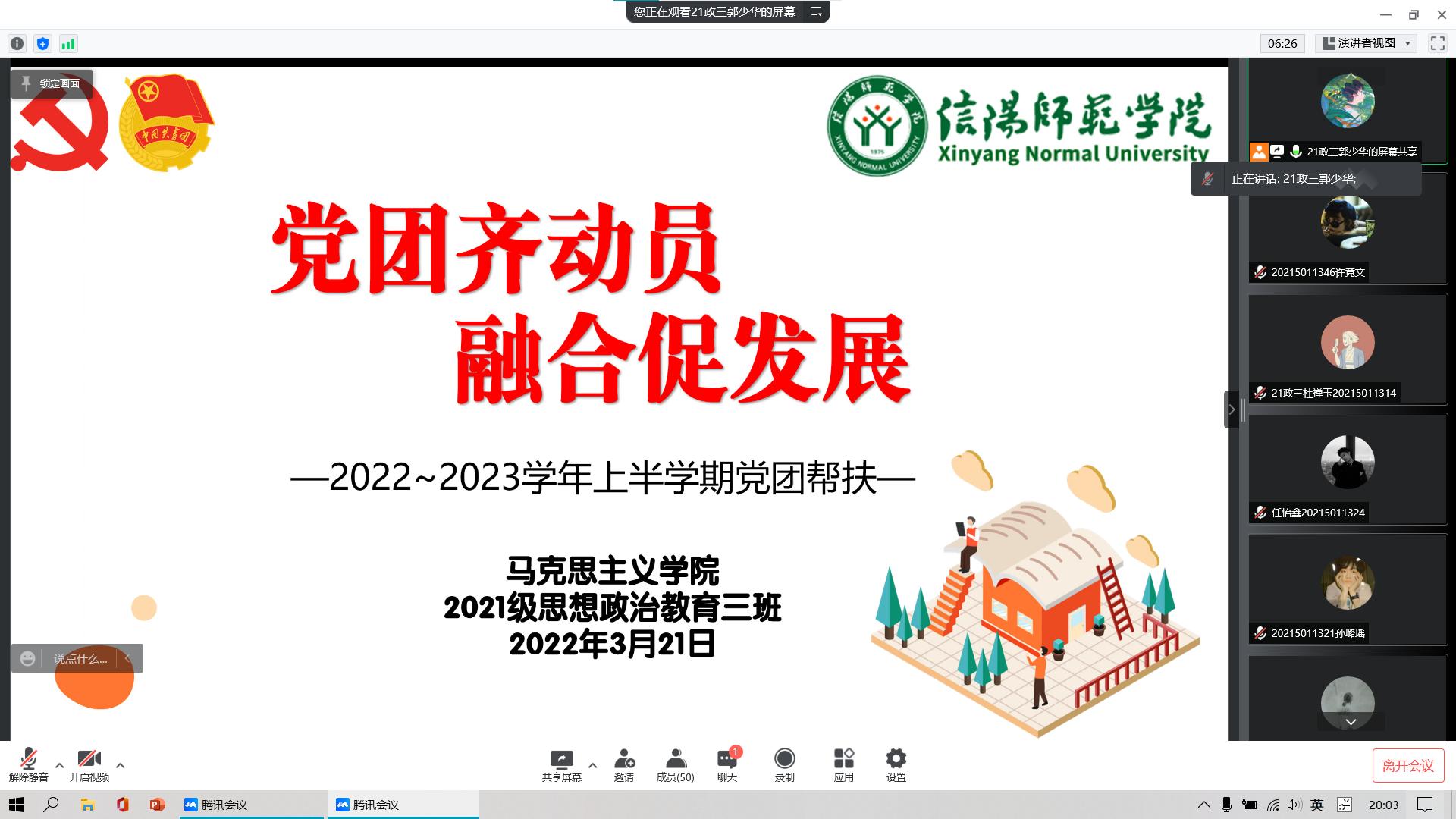 3月21日晚上,太阳集团tyc59972021级思想政治教育三班开展线上“党员齐动员,融合促发展”党团帮扶活动。辅导员高小佳、2019级思想政治教育一班正式党员李梦琦、2019级思想政治教育二班正式党员杨煦华以及2021级思想政治教育三班全体团员参加了此次活动。活动由团支书郭少华主持。