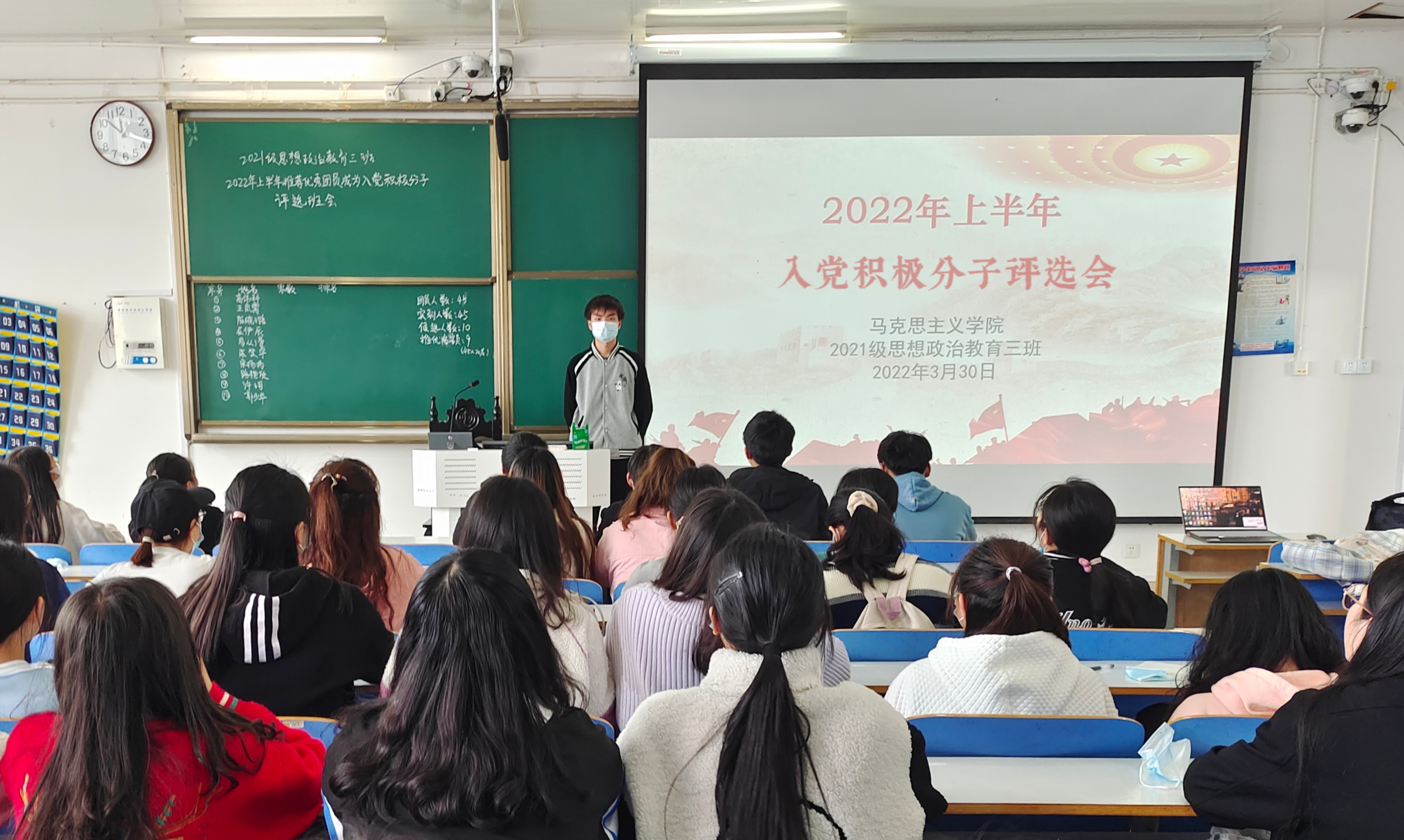 3月30日上午,太阳集团tyc59972021级思想政治教育三班在社科楼514教室召开2022年上半年入党积极分子评选会。2021级思想政治教育三班全体同学参加了此次会议。会议由团支书郭少华主持。