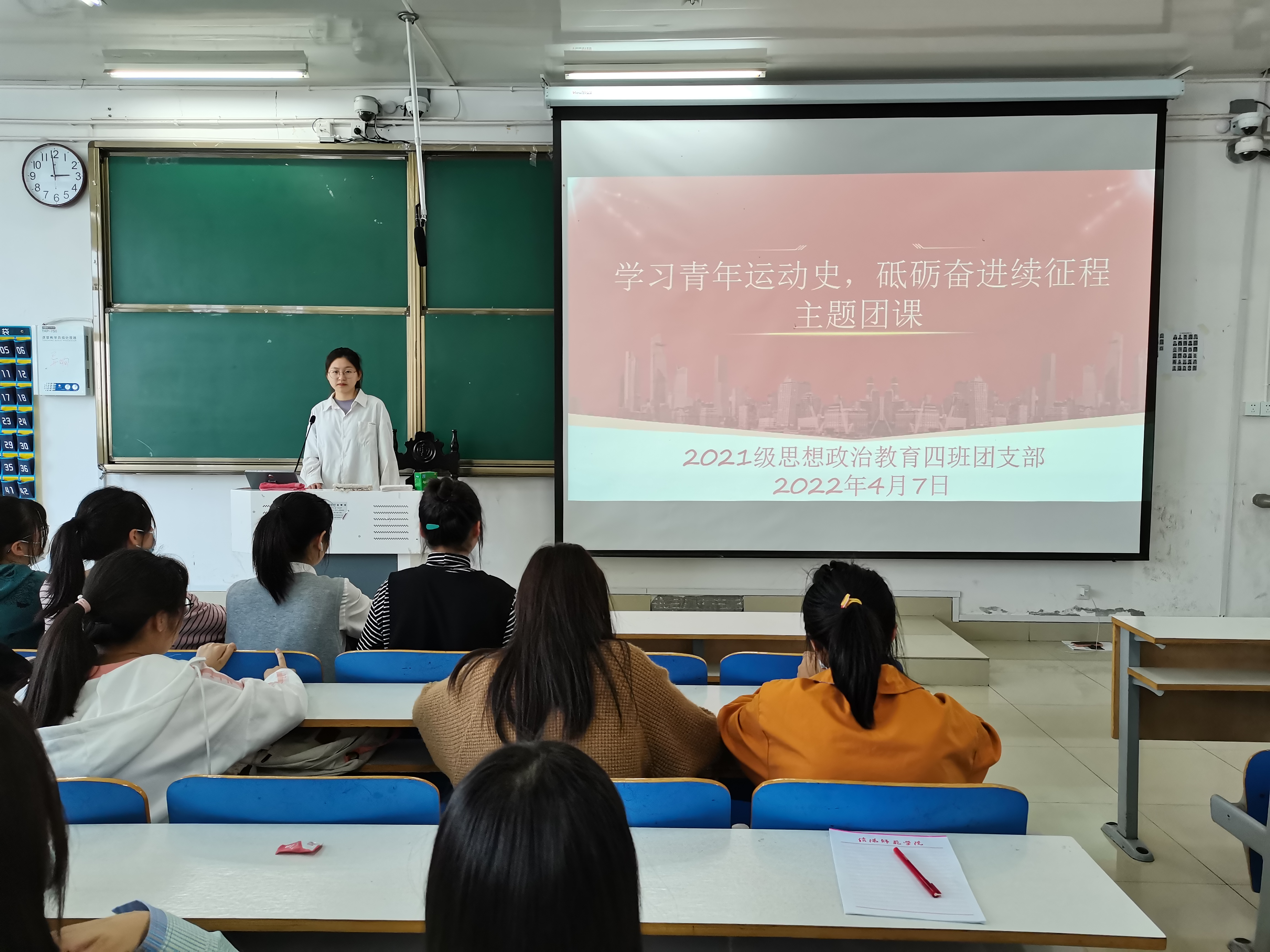 4月7日下午,太阳集团tyc59972021级思想政治教育四班在社科楼516教室开展“学习青年运动史,砥砺奋进绪征程”主题团课。2021级思想政治教育四班全体团员共同参与本次团课,团课由团支书刘珂含主持。
