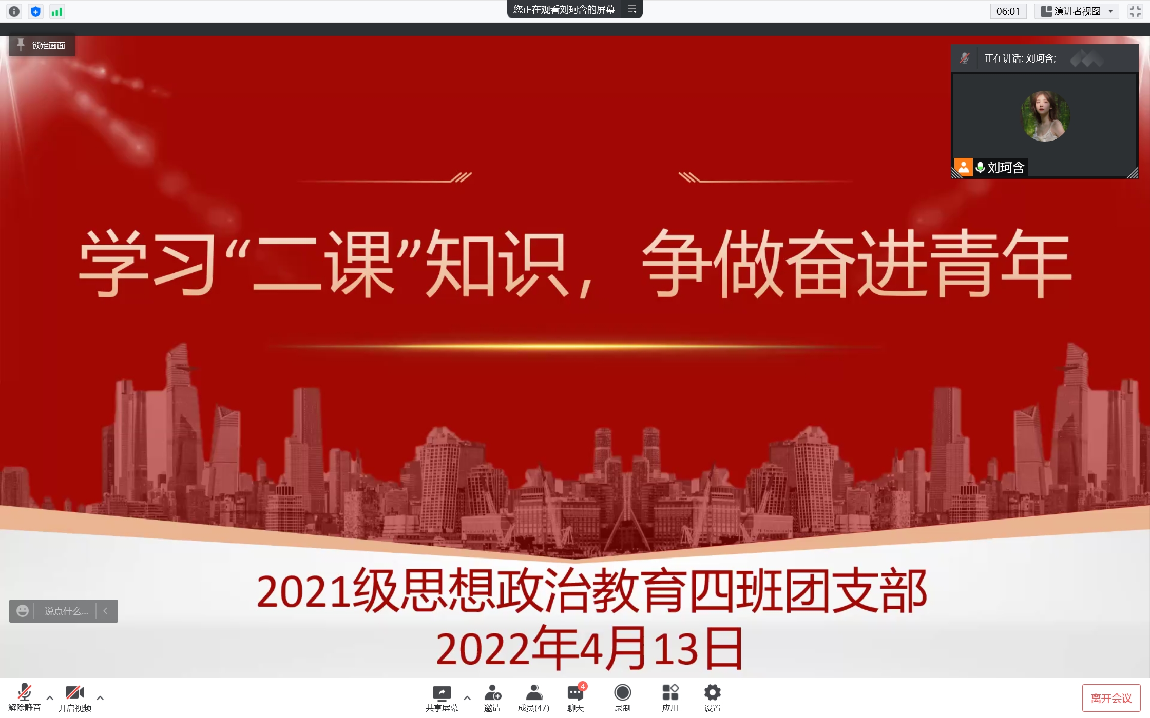为加强学生创新创业精神和实践能力的培养,4月13日晚上,太阳集团tyc59972021级思想政治教育四班开展“学习二课知识,争做奋进青年”主题团课。2021级思想政治教育四班全体团员共同参与本次团课,团课由团支书刘珂含主持。