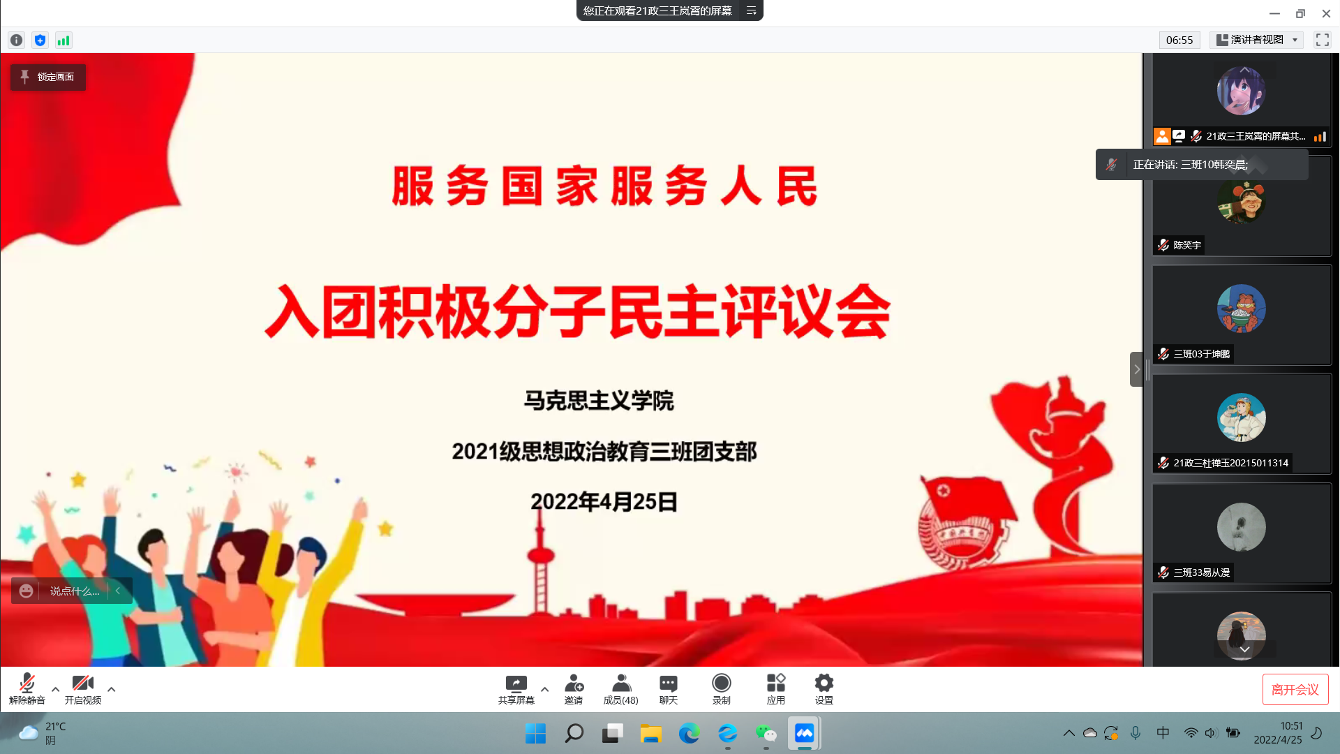 4月25日上午,太阳集团tyc59972021级思想政治教育三班召开线上2022年上半年入团积极分子民主评议会。2021级思想政治教育三班全体团员以及三位候选人参加了此次会议,会议由团支书王岚霄主持。