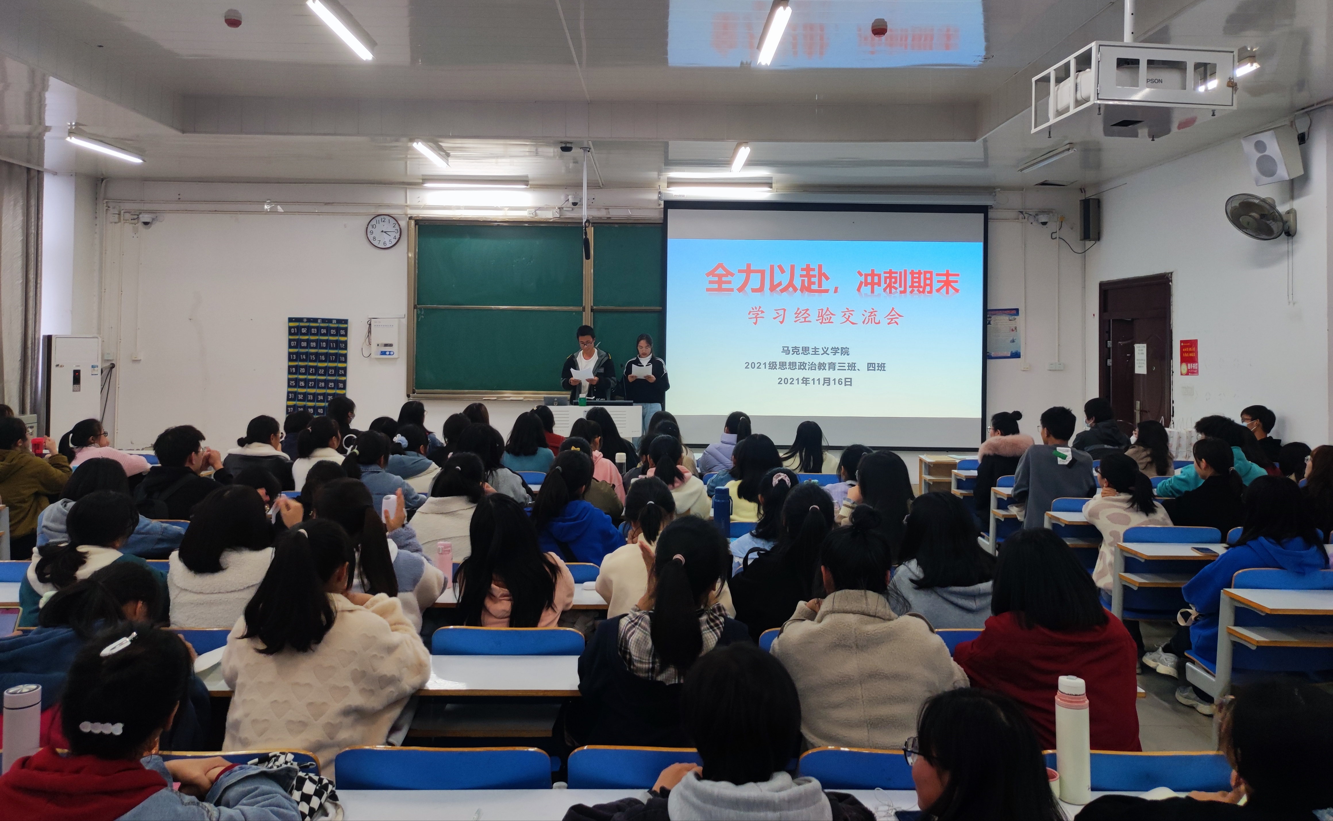 为进一步激发同学们的学习积极性,改进学习方法,帮助同学们更好的明确学习目标,11月16日下午,太阳集团tyc59972021级思想政治教育三班、四班在社科楼515教室开展学习经验交流会。班主任高小佳、2020级优秀学生代表以及2021级思想政治教育三班、四班全体同学参加了本次班会。班会由学习委员于坤鹏、史恪萍主持。