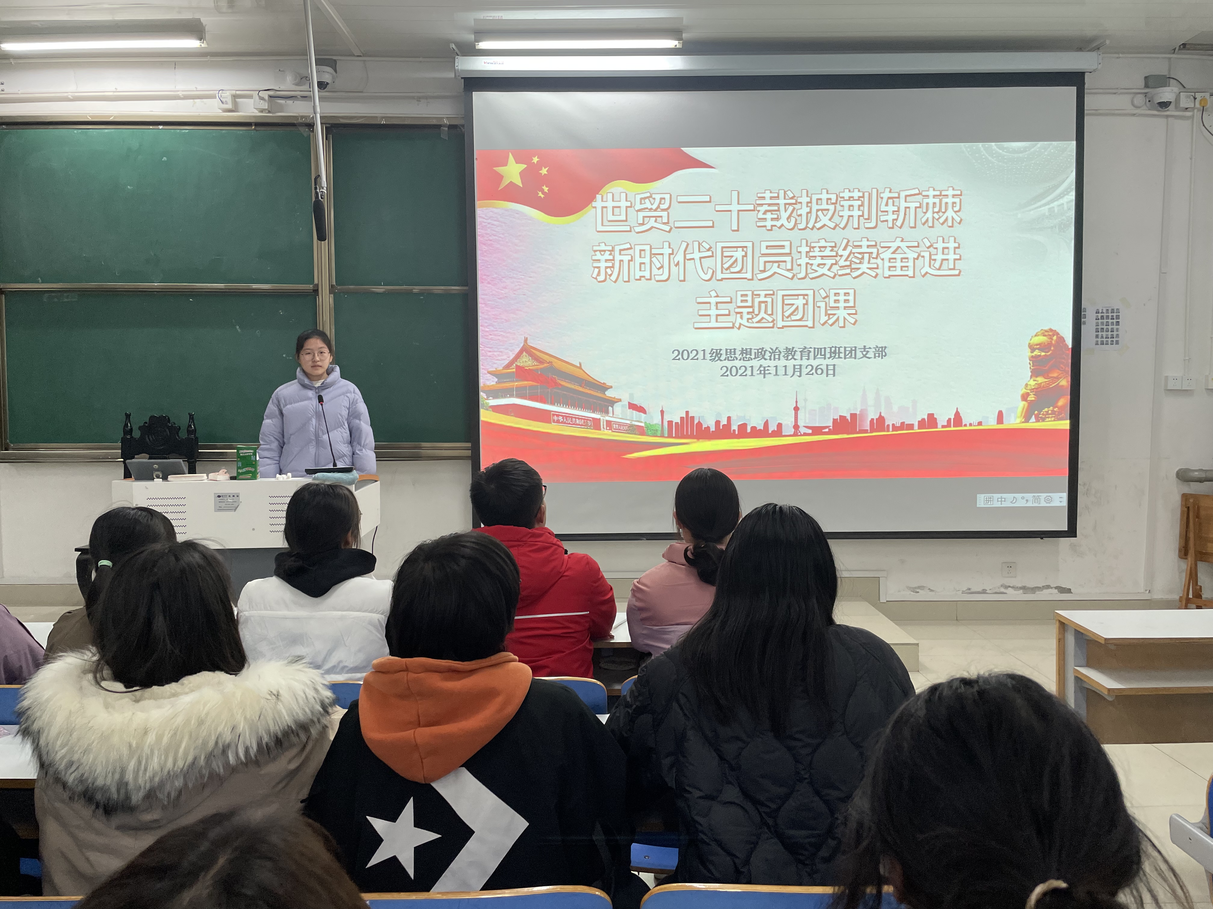 11月26日下午,太阳集团tyc59972021级思想政治教育四班在社科楼514召开“世贸二十载披荆斩棘,新时代团员接续奋进”主题团课。2021级思想政治教育四班全体团员参加本次主题团课,团课由团支书刘珂含主持。