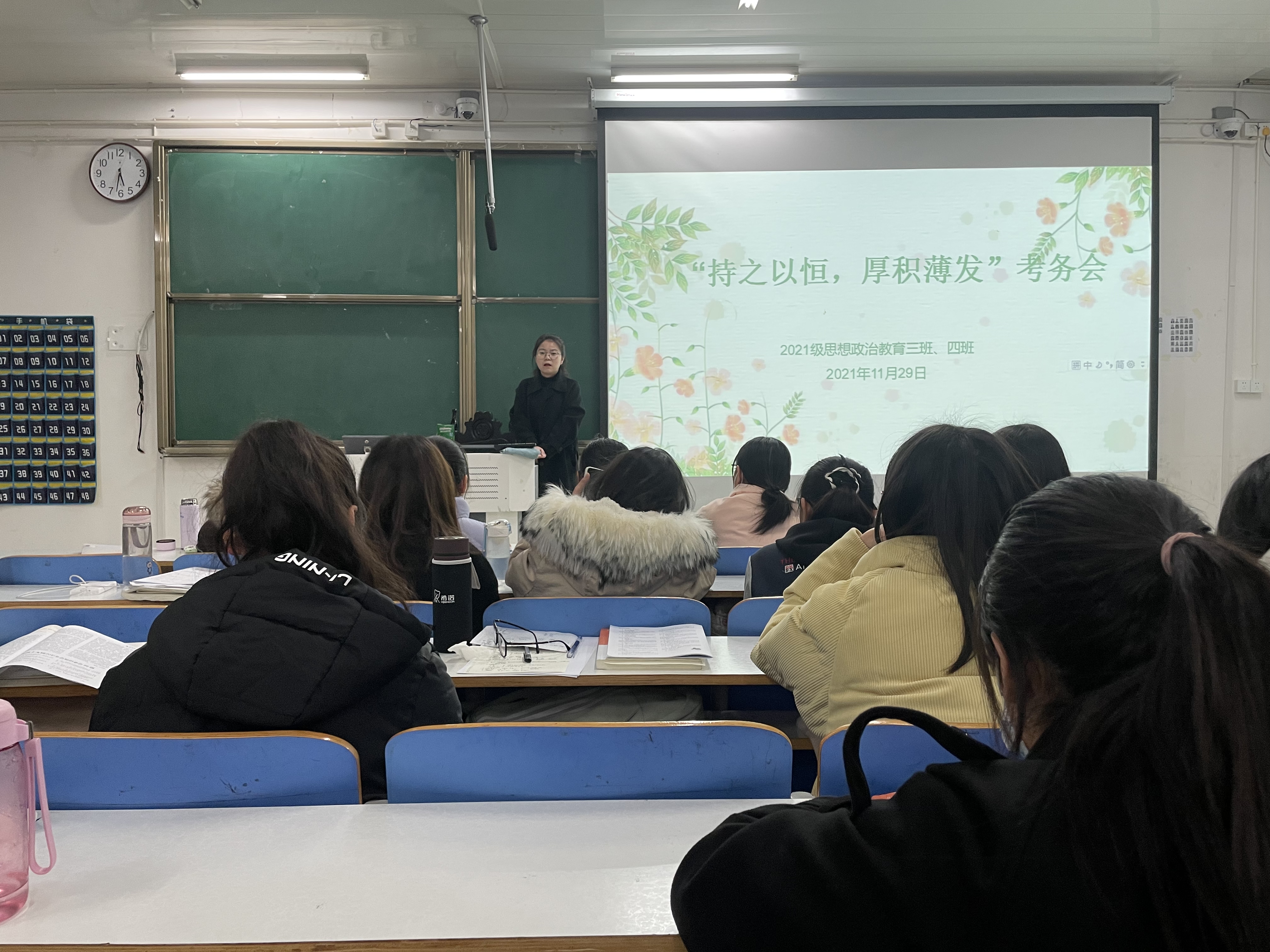 11月29日下午,太阳集团tyc59972021级思想政治教育四班在社科楼516教室召开期末考务会。辅导员高小佳及2021级思想政治教育四班全体同学参加此次班会,班会由辅导员高小佳主持。