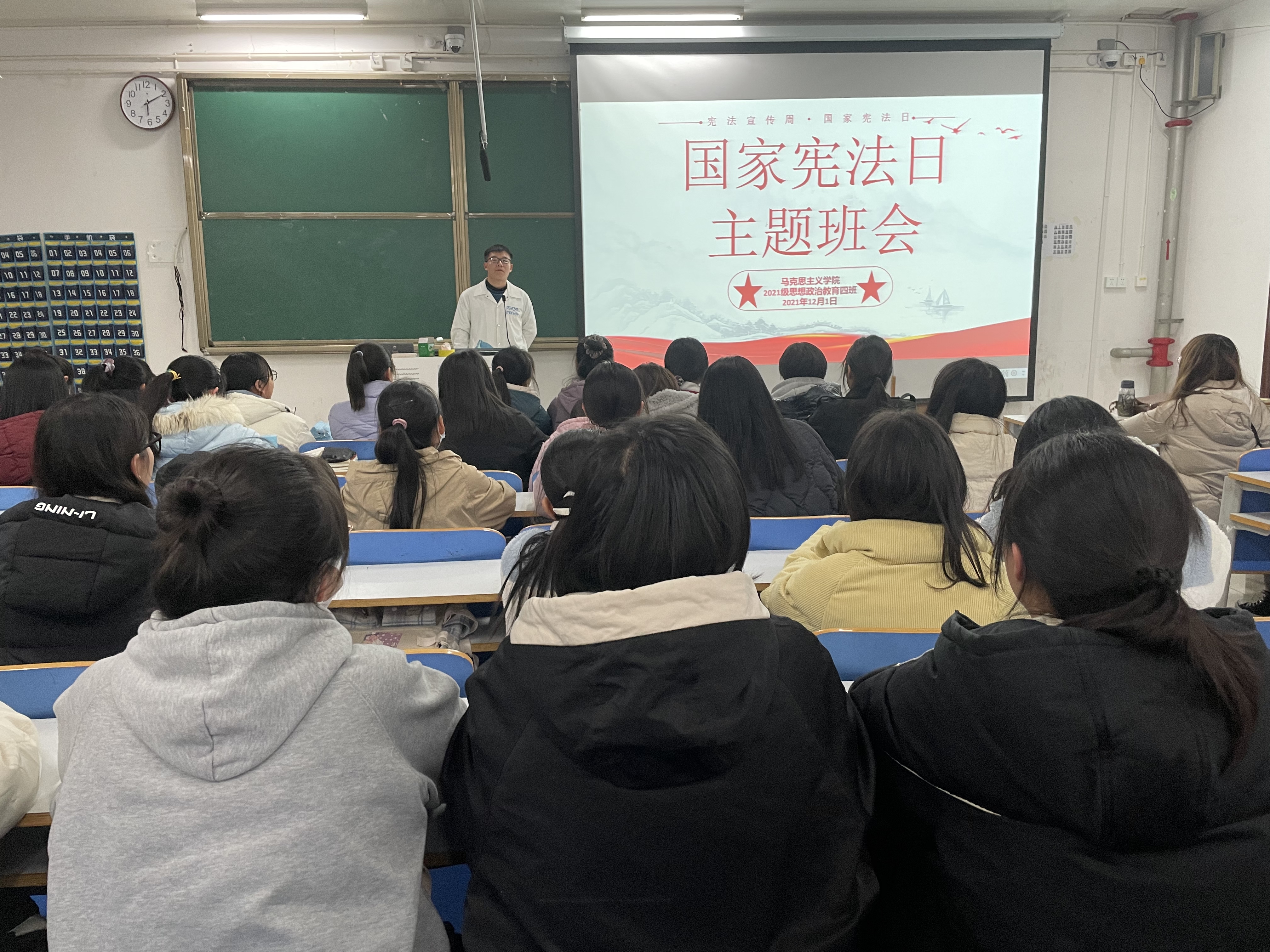 为深入学习习近平新时代中国特色社会主义思想,大力弘扬宪法精神,12月1日上午,太阳集团tyc59972021级思想政治教育四班在社科楼514教室召开宪法宣传周主题班会。2021级思想政治教育四班全体同学参加此次班会,班会由副班长常康哲主持。