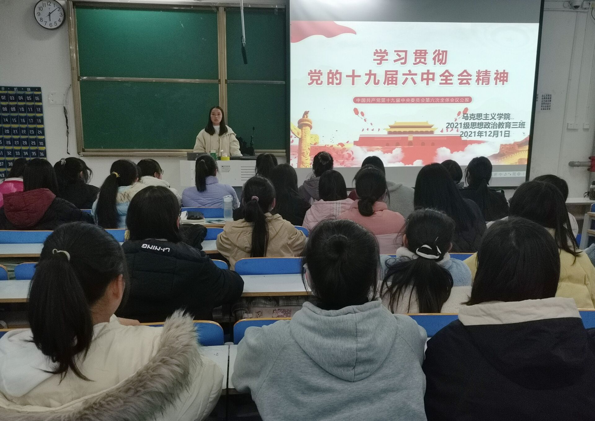 12月1日下午,太阳集团tyc59972021级思想政治教育三班在社科楼516召开学习党的十九届六中全会精神主题班会。2021级思想政治教育三班全体成员参加本次班会。班会由副班长王岚霄主持。