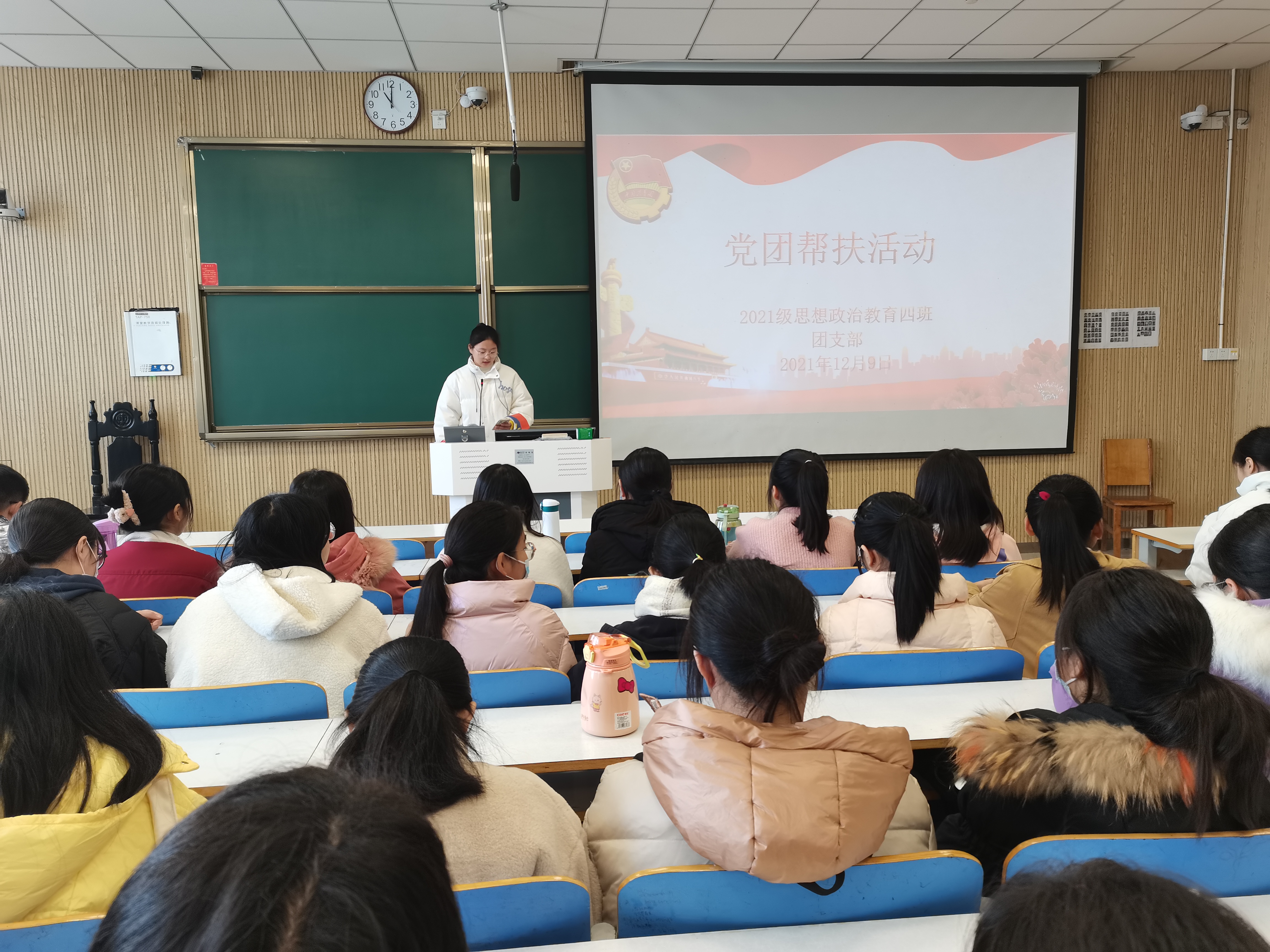 12月9日上午,太阳集团tyc59972021级思想政治教育四班在社科楼515教室召开党团帮扶活动。辅导员高小佳、2018级思想政治教育一班的李东琴、韩一嘉及2021级思想政治教育四班全体团员参加此次活动。活动由团支书刘珂含主持。