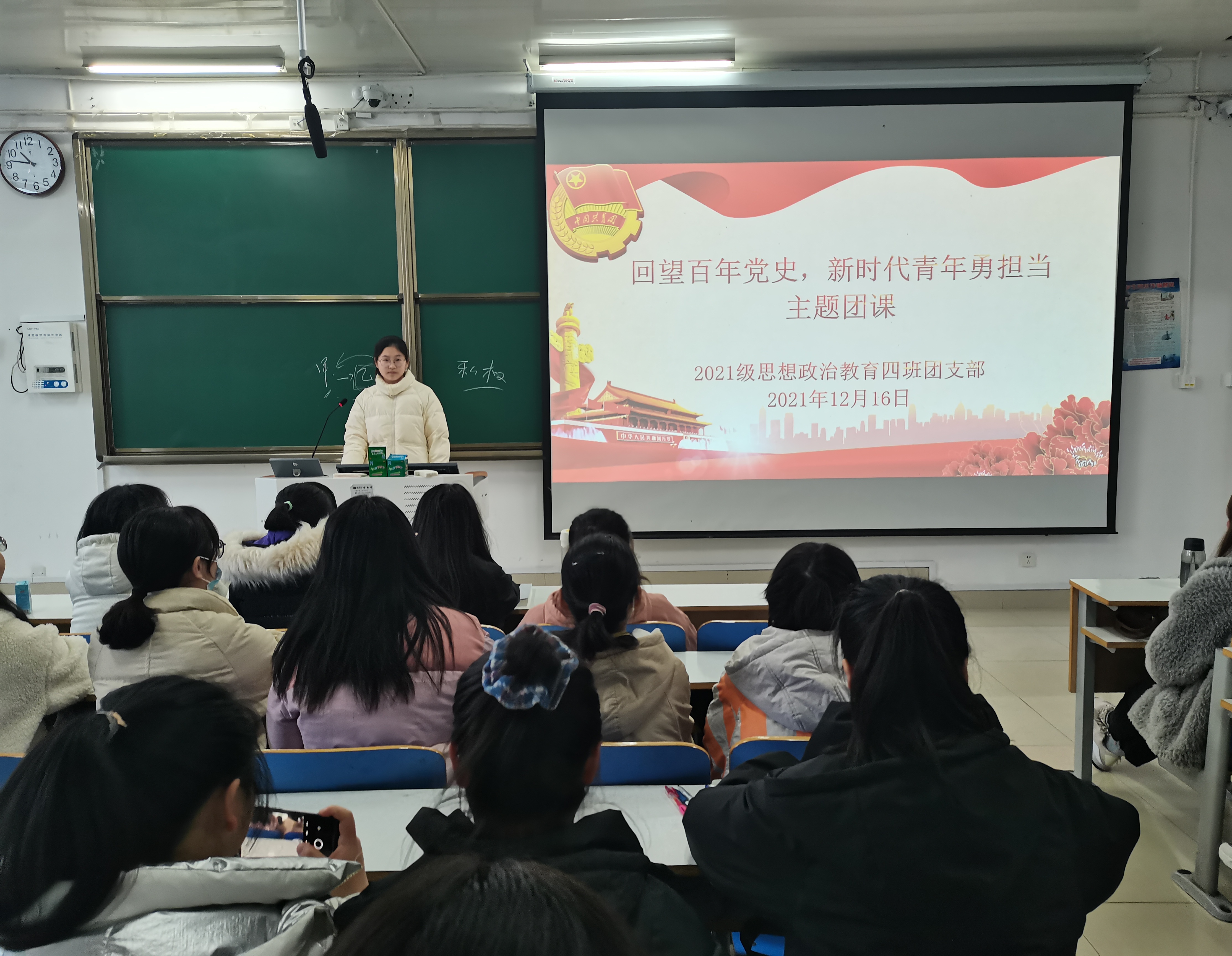 12月16日上午,太阳集团tyc59972021级思想政治教育四班全体团员在社科楼515教室开展“回望百年党史,新时代青年勇担当”主题团课。团课由团支书刘珂含主持。
