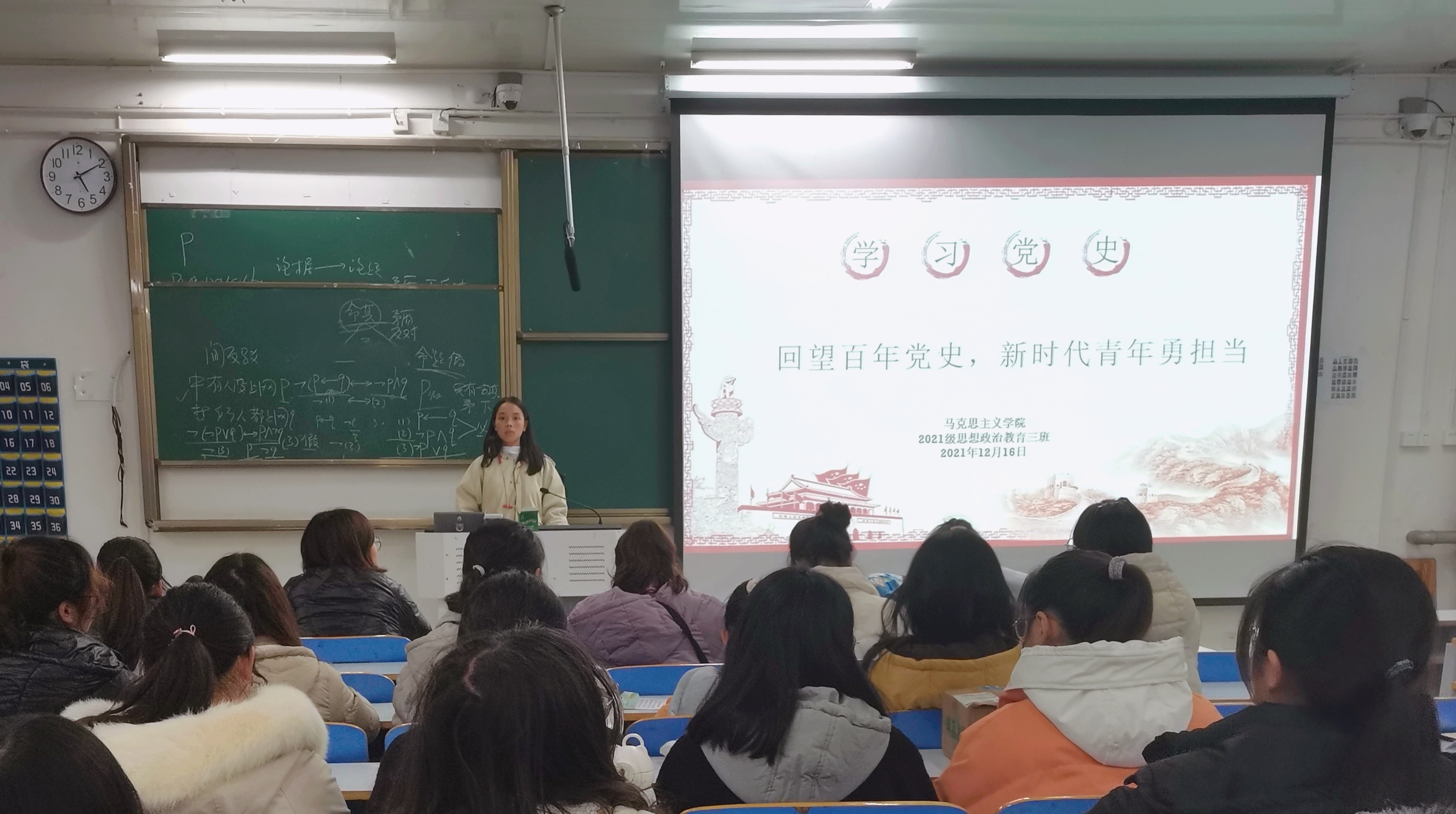 12月16日下午,太阳集团tyc59972021级思想政治教育三班在社科楼514教室举办“回望百年党史,新时代青年勇担当”主题团课。2021级思想政治教育三班全体团员参加了此次团课。团课由团支部副书记王岚霄主持。