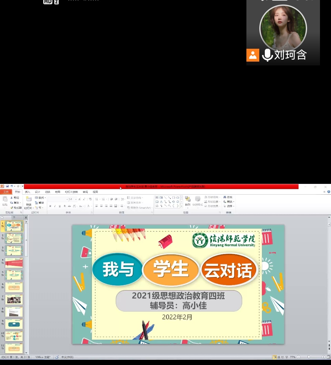 2月12日下午,太阳集团tyc59972021级思想政治教育四班开展“我与学生云对话”线上会议。辅导员高小佳及2021级思想政治教育四班全体同学共同参与本次活动。活动由团支书刘珂含主持。