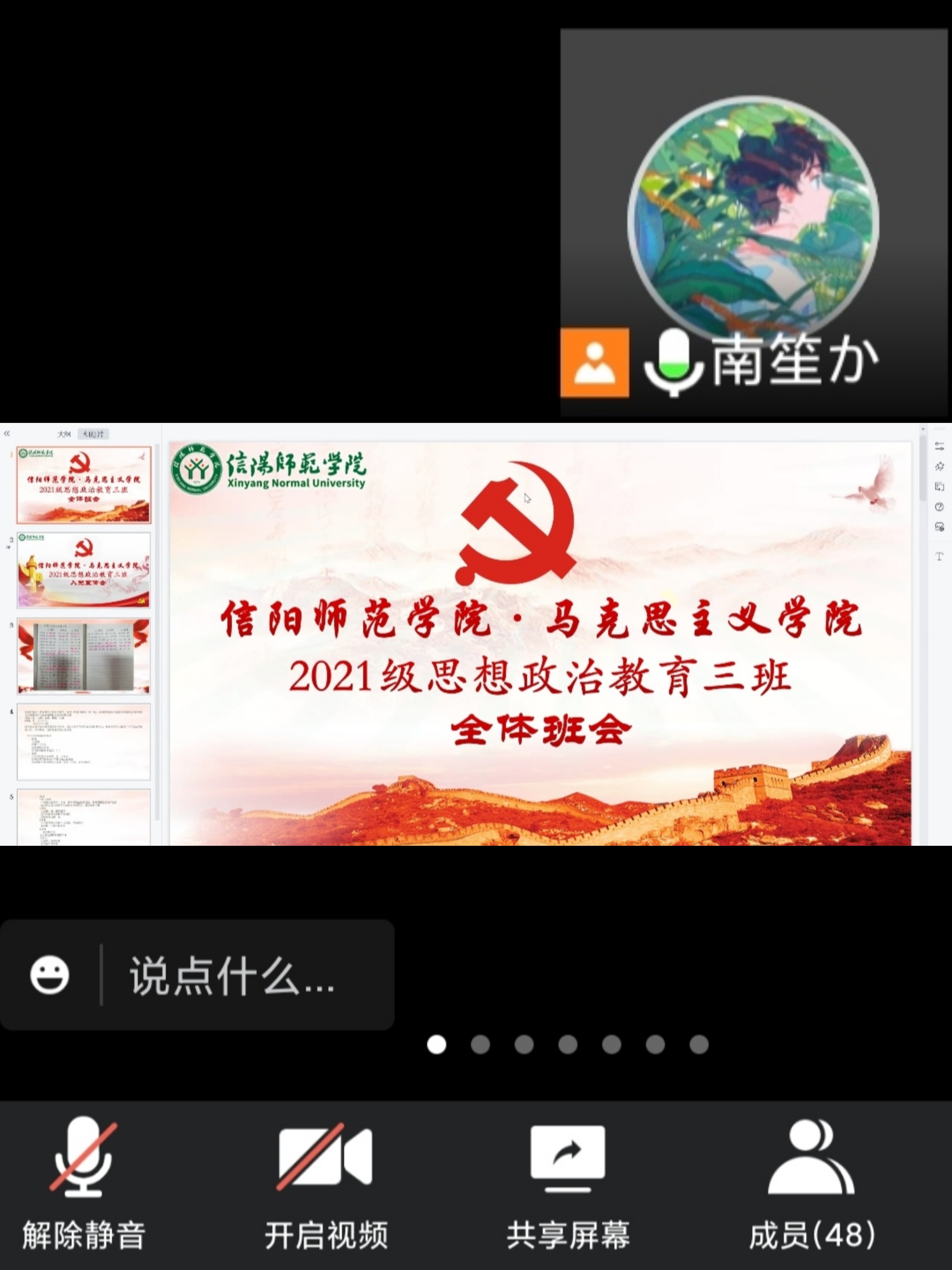 为增强同学们对入党的重视和调动同学们参与班务的积极性,10月14日晚上,太阳集团tyc59972021级思想政治教育三班入党宣传会暨全体班会在腾讯会议上顺利召开。太阳集团tyc59972021级思想政治教育三班全体同学共同参加,会议由团支书郭少华和副班长王岚霄主持。