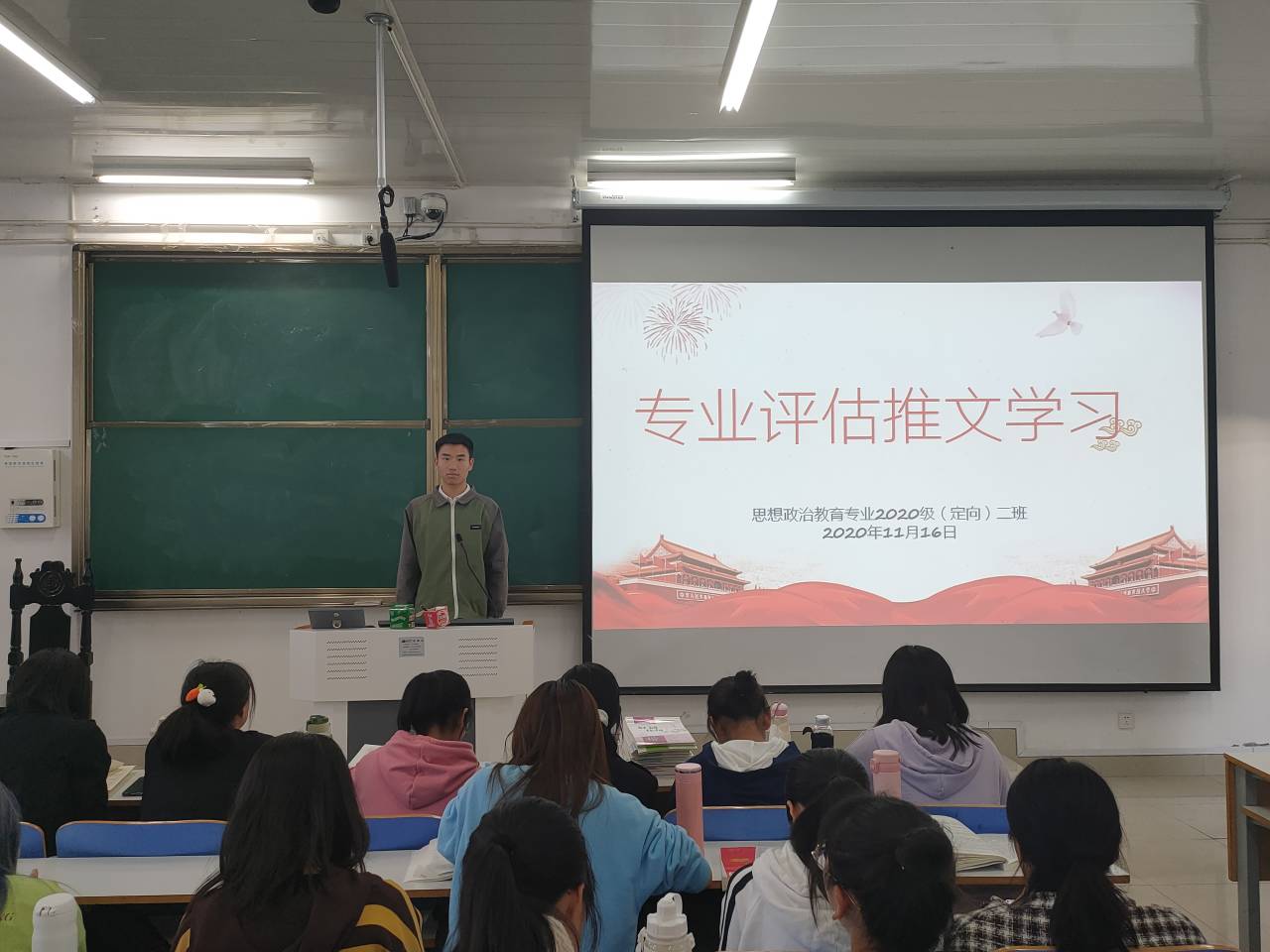 11月13日至16日,太阳集团tyc59972020级思想政治教育定向二班专业评估系列推文学习主题班会在社科楼514教室顺利开展,班会由副班长高红凯主持。