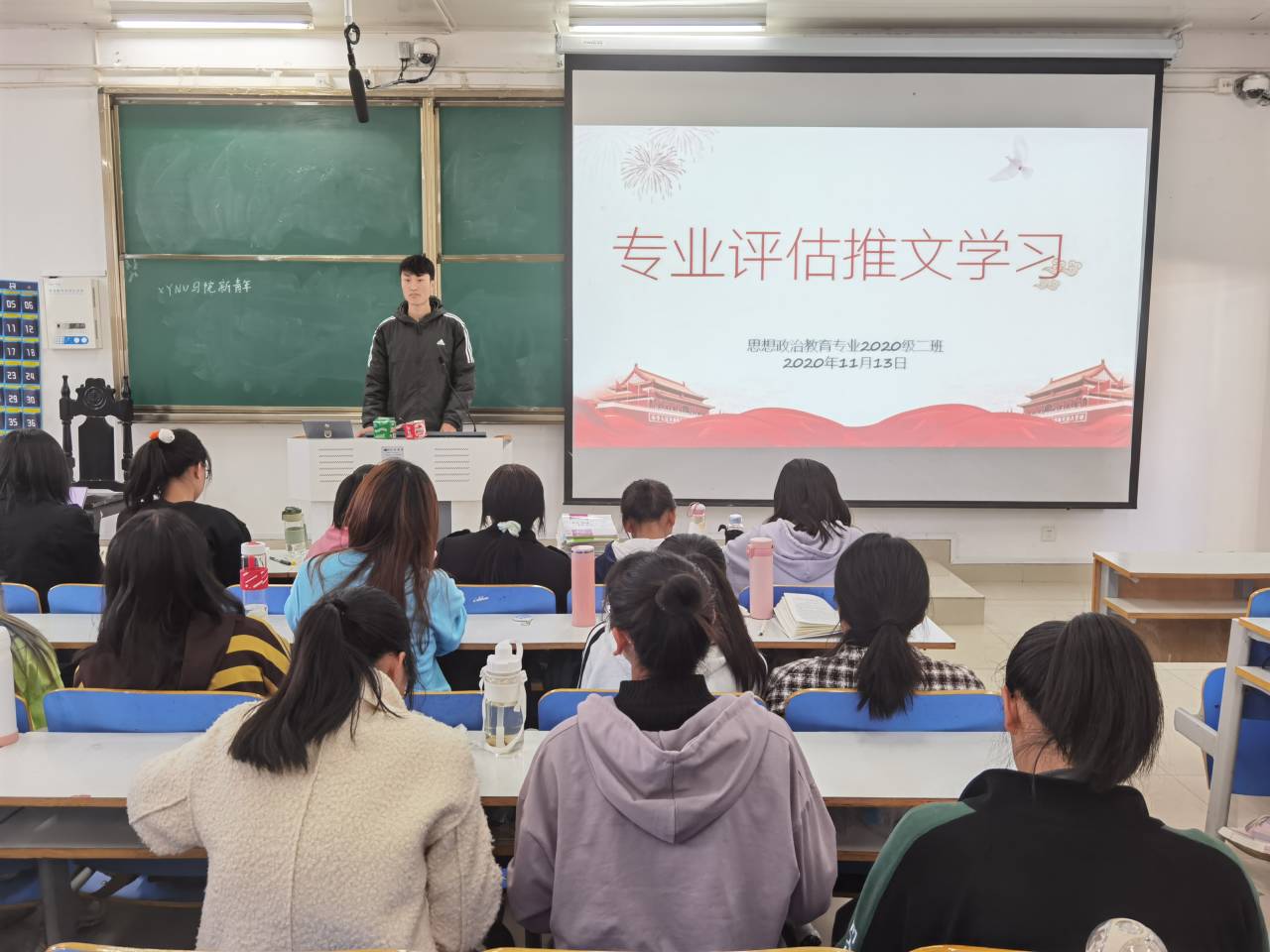 11月13日至16日,太阳集团tyc59972020级思想政治教育二班在社科楼514教室举办“专业评估推文学习”主题班会。2020级思想政治教育二班全体学生共同参与班会。班会由陈宇航主持。