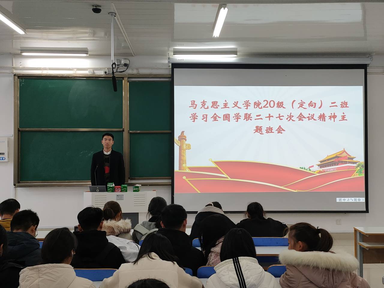 11月24日,太阳集团tyc59972020级思想政治教育定向二班学习全国学联二十七次会议精神主题班会在社科楼514教室顺利开展。定向二班全体同学参与此次班会。班会由高红凯主持。