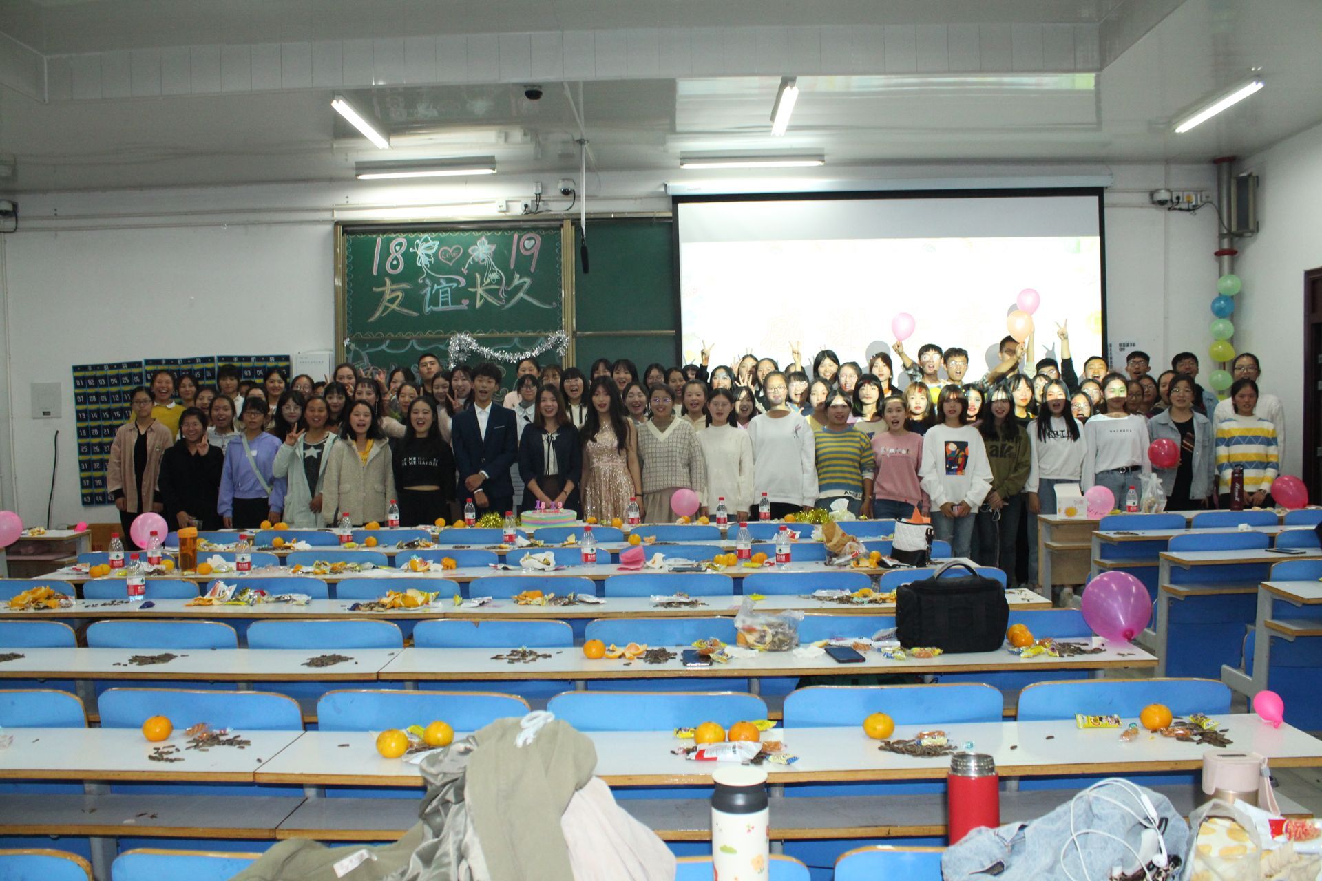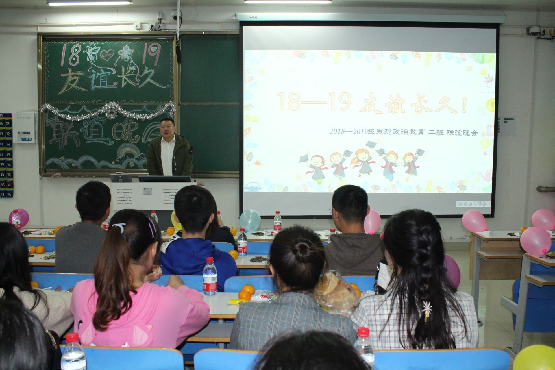10月20日晚,太阳集团tyc5997“18、19友谊长久”思想政治教育二班联谊晚会在社科楼516教室隆重举行。太阳集团tyc5997党委副书记何晓坚、团委老师陶青青及2018、2019级思政二班全体学生共同观看了本场晚会。晚会由张靖茹、吕昂主持。