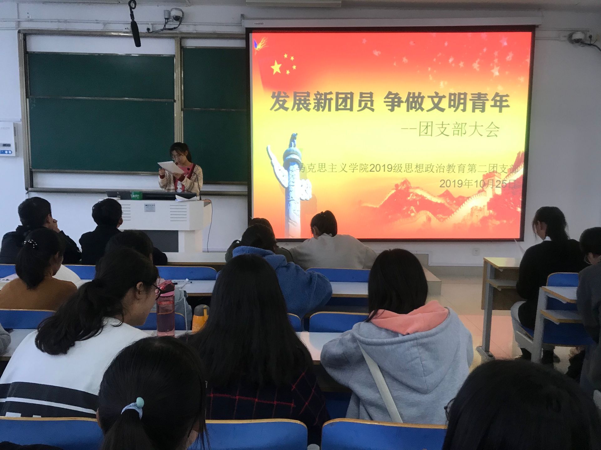 为进一步加强团队组织建设,发展壮大团员队伍,10月25日下午,我院在社科楼514教室召开主题为“发展新团员,争做文明青年”的团支部大会。2019级思政二班全体新生共同参会。会议由团支书孙雅娴主持。