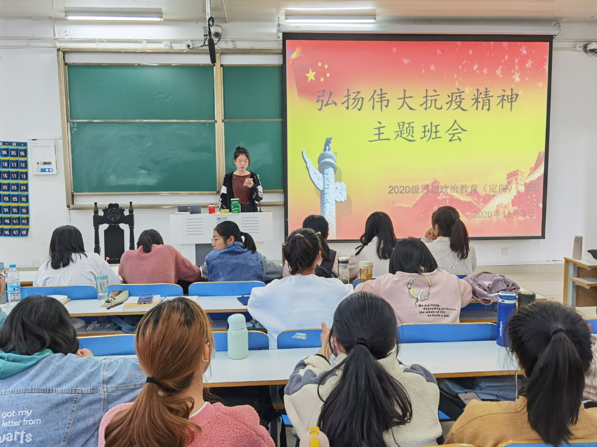 为大力弘扬伟大抗疫精神、激发学生的爱国热情,11月3日上午,太阳集团tyc59972020级思想政治教育定向二班在社科楼514教室召开了“弘扬伟大抗疫精神”主题班会。班会由团支书李晨曦主持。