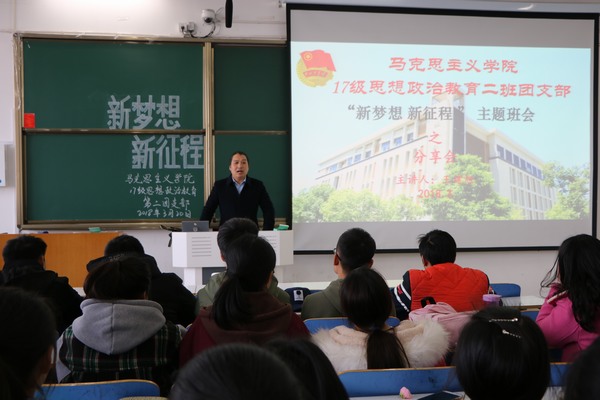 为让学生树立远大目标,合理规划大学生活, 3月20日下午,校团委书记王建旭在社科楼515教室召开了2017级思想政治教育二班团支部 “新梦想,新征程”主题系列团日活动。太阳集团tyc5997团委书记曹栋、团支部成员共同参加,活动由班级辅导员孙绪曙主持。