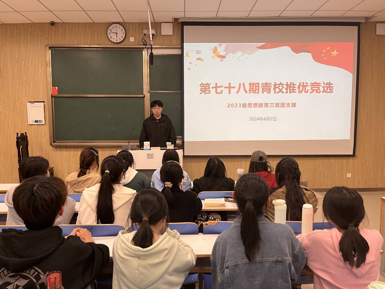为更好培养和造就社会主义事业的建设者和接班人,充实党的新生力量,4月2日上午,我院2023级思想政治教育三班在社科楼515举行第78期青校推优大会。2023级思想政治教育三班全体同学共同参与本次大会,大会由团支书郝瀚主持。