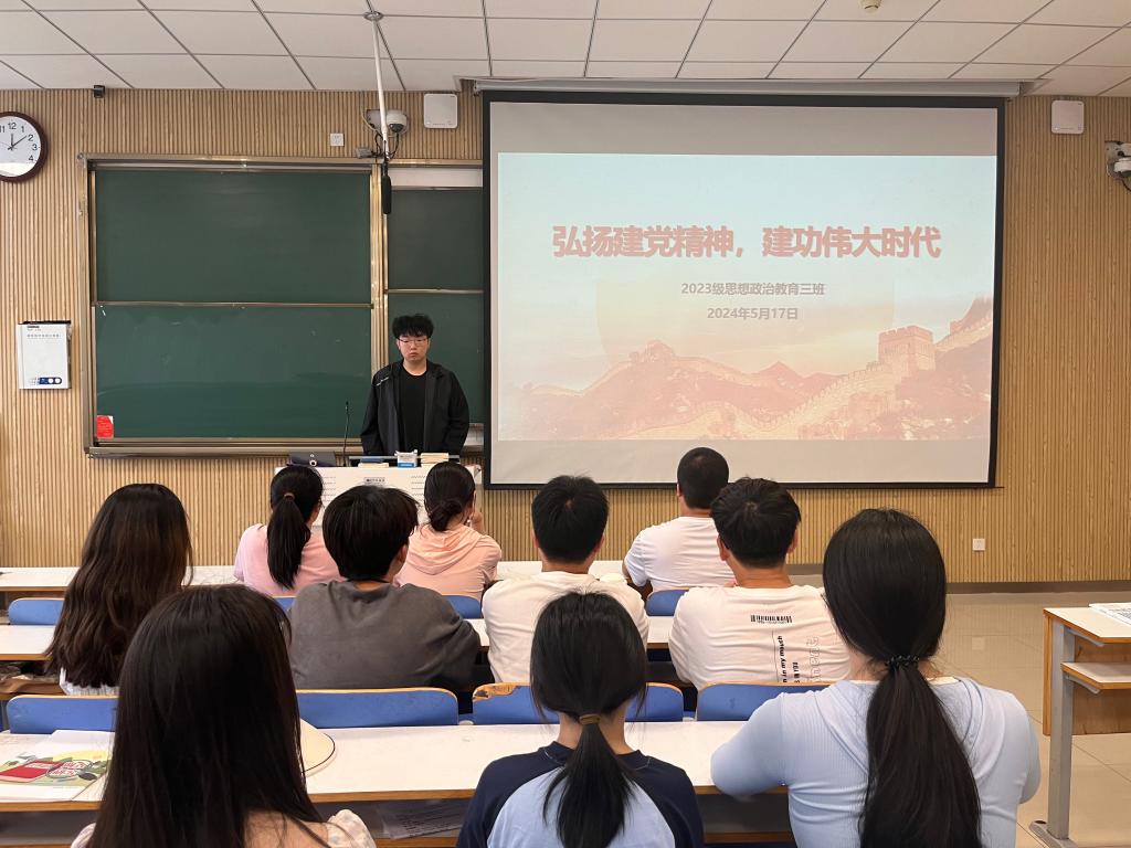 为弘扬伟大建党精神,走好新时代赶考之路,5月17日上午,太阳集团tyc59972023级思想政治教育三班在社科楼515召开“弘扬建党精神,建功伟大时代”主题团课。我院2023级思想政治教育三班全体同学共同参与本次团课,团课由团支书郝瀚主持。