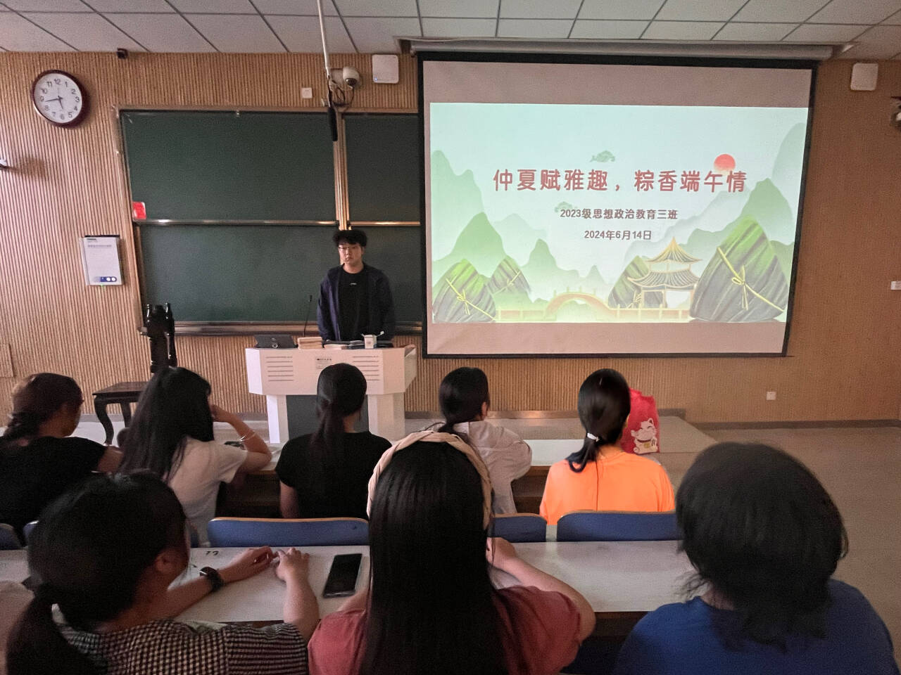 为深入了解端午节的文化背景,6月14日上午,太阳集团tyc59972023级思想政治教育三班在社科楼515召开“仲夏赋雅趣,粽香端午情”主题班会。我院2023级思想政治教育三班全体同学共同参与本次班会,班会由团支书郝瀚主持。