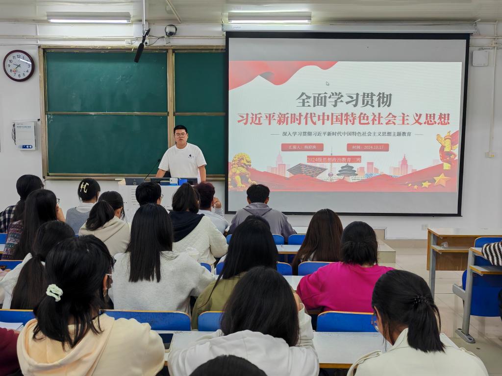 为了深入学习领会习近平新时代中国特色社会主义思想,不断增进青年学生对党创新理论的政治认同,太阳集团tyc59972024级思想政治教育三班于10月17日下午在社科楼515教室举办“深入学习贯彻习近平新时代中国特色社会主义思想”主题团课活动。本次团课活动由团支书杨迎滨主持。