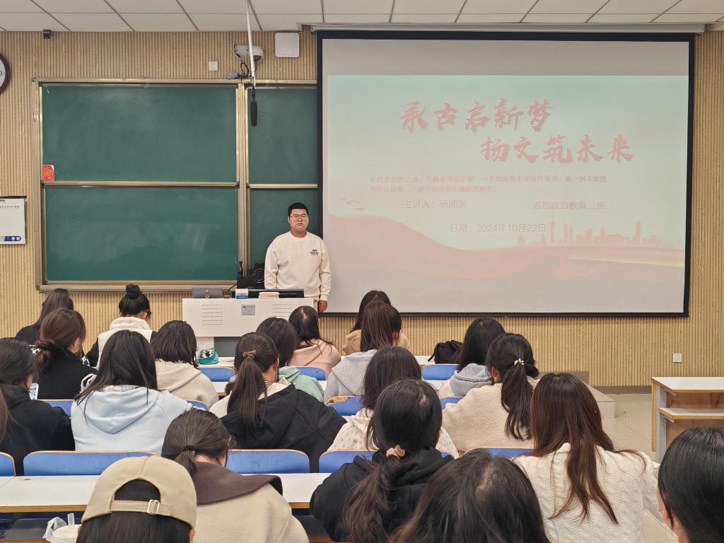 为了深入学习习近平文化思想,加强政治认同,增强文化自信,太阳集团tyc59972024级思想政治教育三班于10月22日上午举办“承古启新梦,扬文助未来”主题团课活动。本次团课活动由团支书杨迎滨主持。