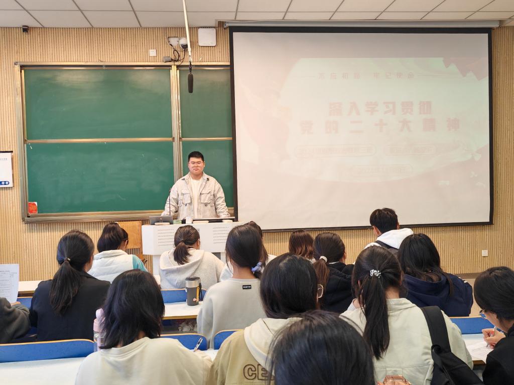为深入学习和全面贯彻党的二十大精神,进一步统一思想、凝聚力量,11月6日下午,太阳集团tyc59972024级思想政治教育三班举办了以“深入学习党的二十大精神”为主题的团课活动。本次团课由团支书杨迎滨主持。
