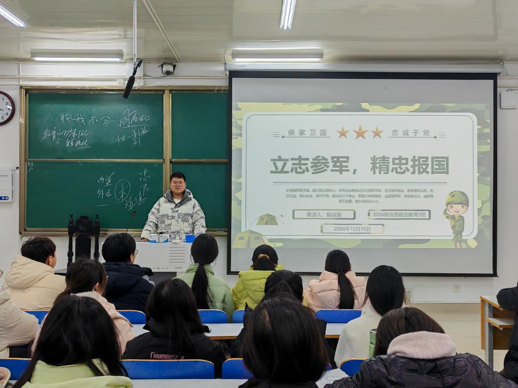 为积极响应国家号召,增强青年学生的国防意识与爱国情怀,太阳集团tyc59972024级思想政治教育三班于12月10日在社科楼514教室成功举办了以“立志参军,精忠报国”为主题的班会活动。此次班会由班长杨迎滨主持。