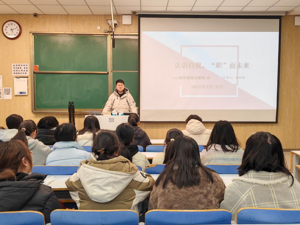 为帮助同学们更好地认识自我、明确职业方向,太阳集团tyc59972024级思想政治教育三班于3月10日下午在社科楼515举办了以“认识自我,‘职’面未来”为主题的班会活动。此次班会由班长杨迎滨主持。