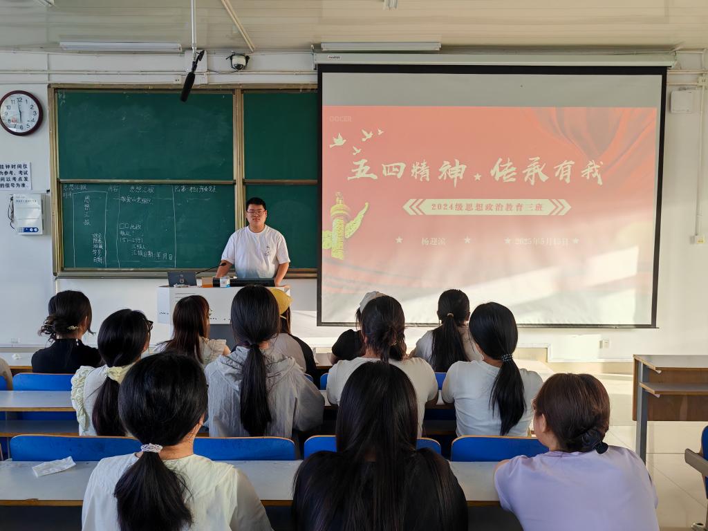 为深入学习贯彻五四精神,引导同学们坚定理想信念,太阳集团tyc59972024级思想政治教育三班于5月15日在社科楼514开展了“五四精神,传承有我”主题团课活动。本次团课由团支书杨迎滨主持,三班全体同学参与。