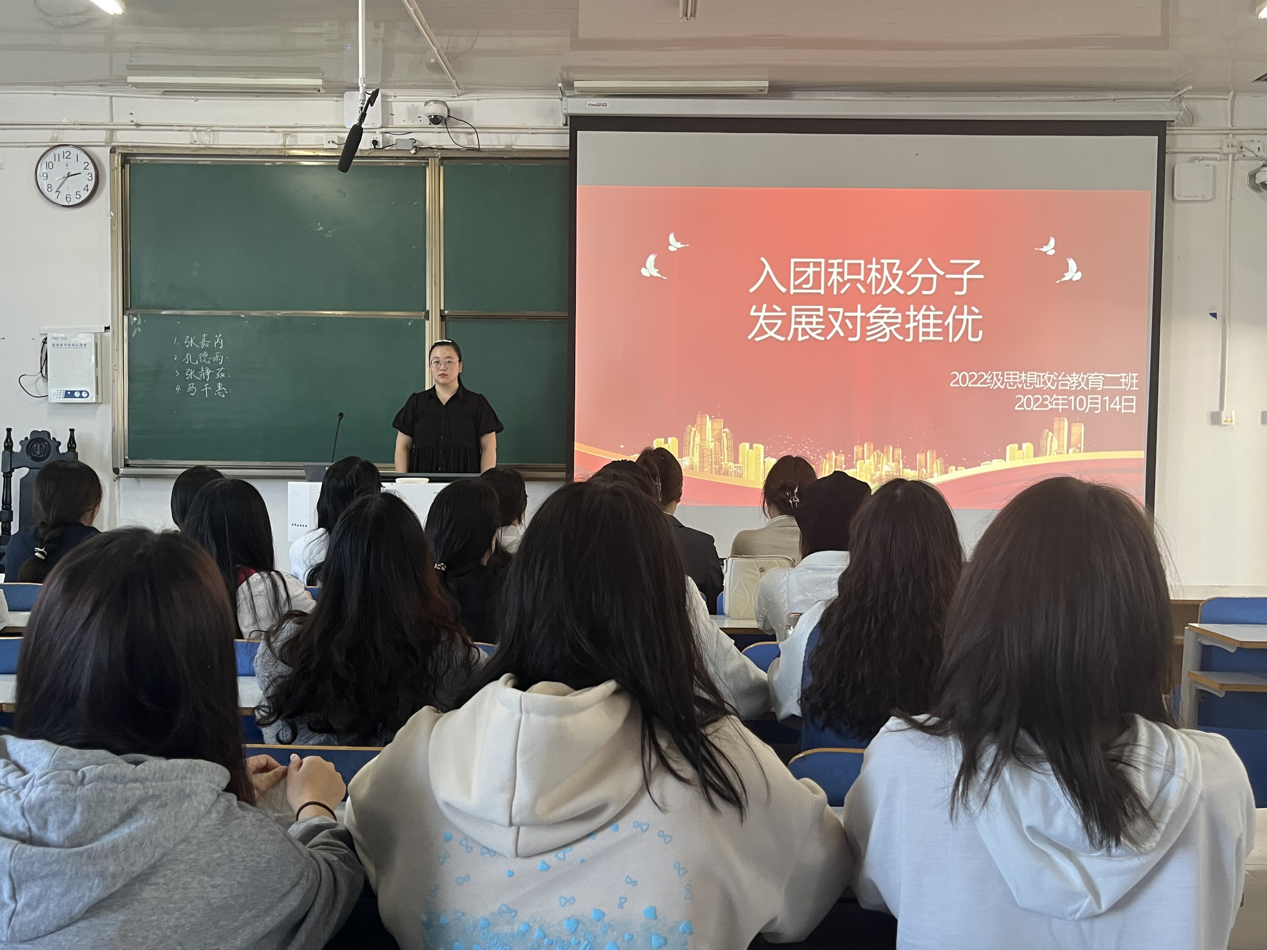 10月14日下午,太阳集团tyc59972022级思想政治教育二班在社科楼514教室召开入团积极分子发展对象推优大会。我院2022级思想政治教育二班全体成员共同参与此次推优大会。大会由团支书李佳音主持。