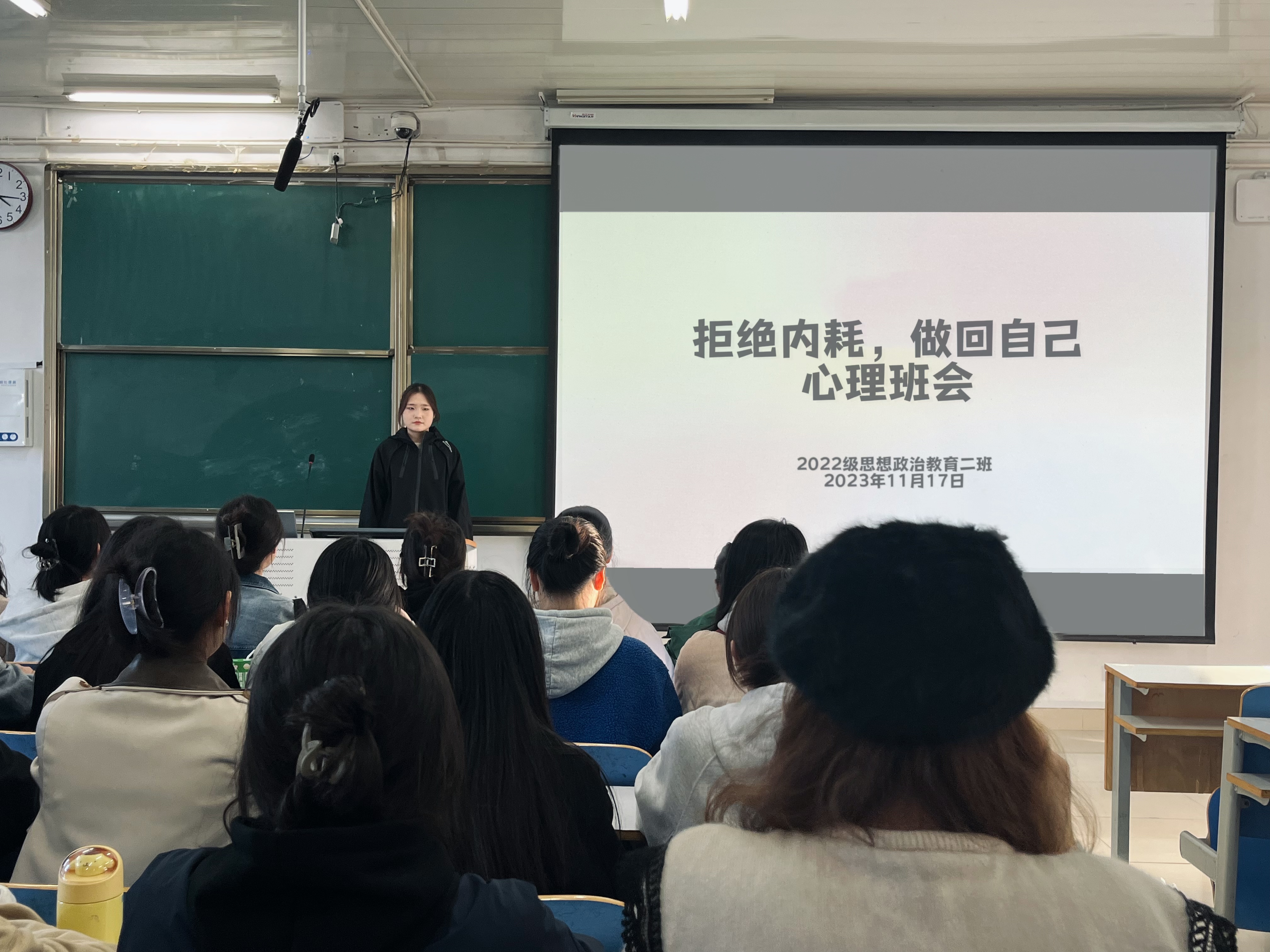 11月17日下午,太阳集团tyc59972022级思想政治教育二班在社科楼514教室开展“拒绝内耗,做回自己”心理班会。我院2022级思想政治教育二班全体成员共同参与此次心理班会。班会由心理委员张嘉芮主持。
