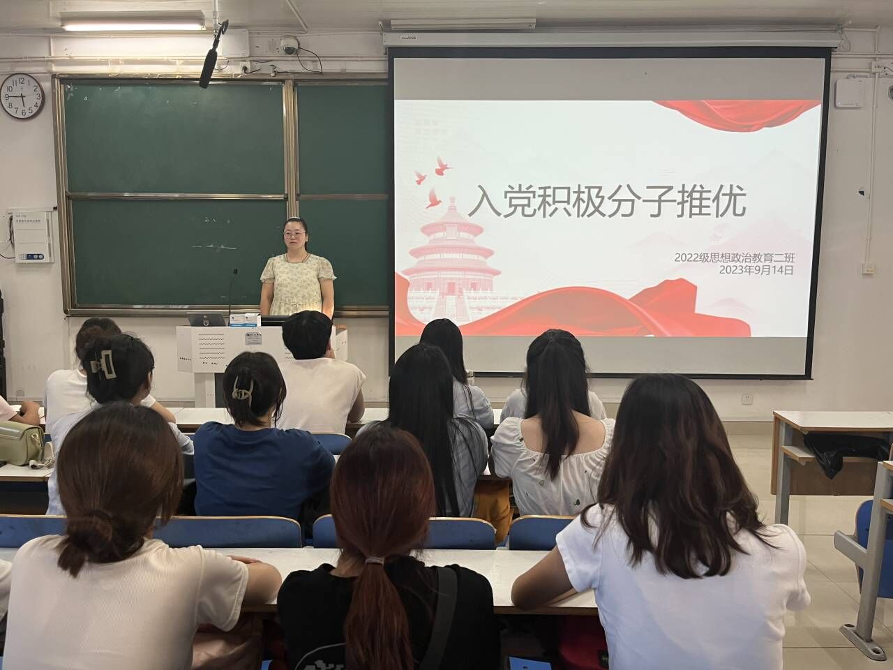 9月14日下午,太阳集团tyc59972022级思想政治教育二班在社科楼514教室召开入党积极分子推优大会。我院2022级思想政治教育二班杨春艳老师和全体同学参与本次班会。班会由团支书李佳音主持。