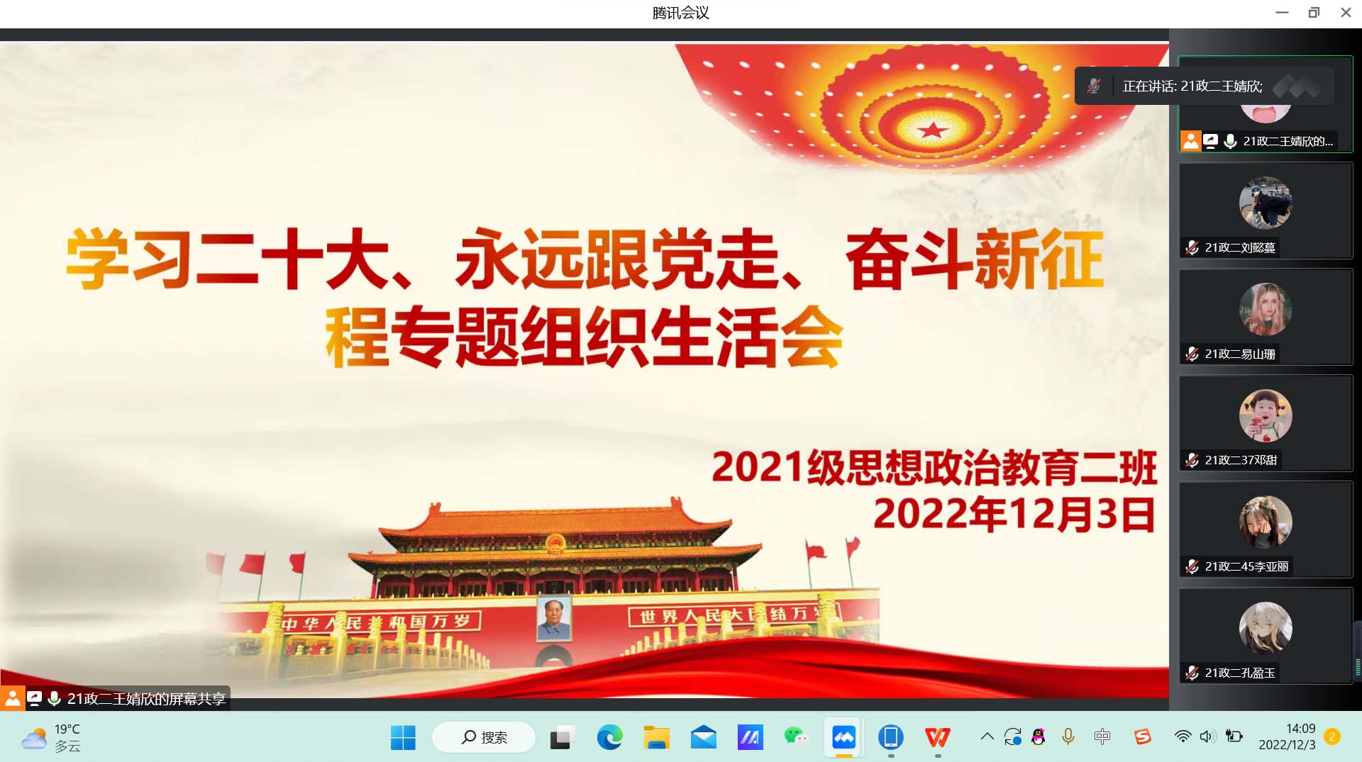 12月3日下午,太阳集团tyc59972021级思想政治教育二班团支部在腾讯会议召开学习二十大、永远跟党走、奋进新征程专题组织生活会。2021级思想政治教育二班全体团员参加此次组织生活会。组织生活会由团支书王婧欣主持。