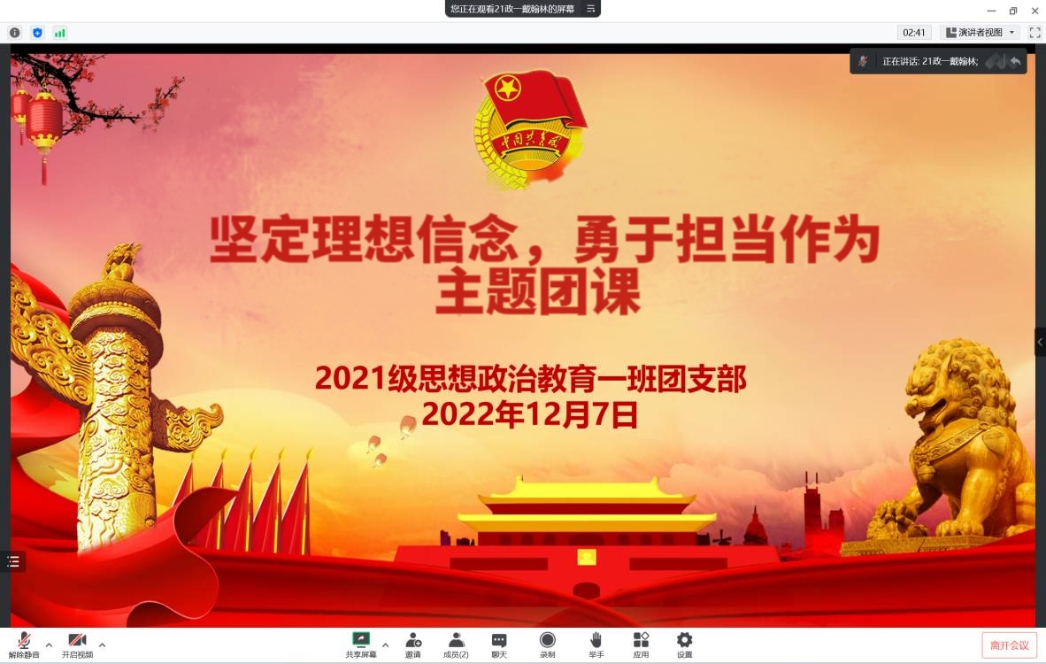 12月7日下午,太阳集团tyc59972021级思想政治教育一班在腾讯会议召开线上“坚定理想信念,勇于担当作为”主题团课。2021级思想政治教育一班全体团员共同参加了本次团课。团课由团支书戴翰林主持。