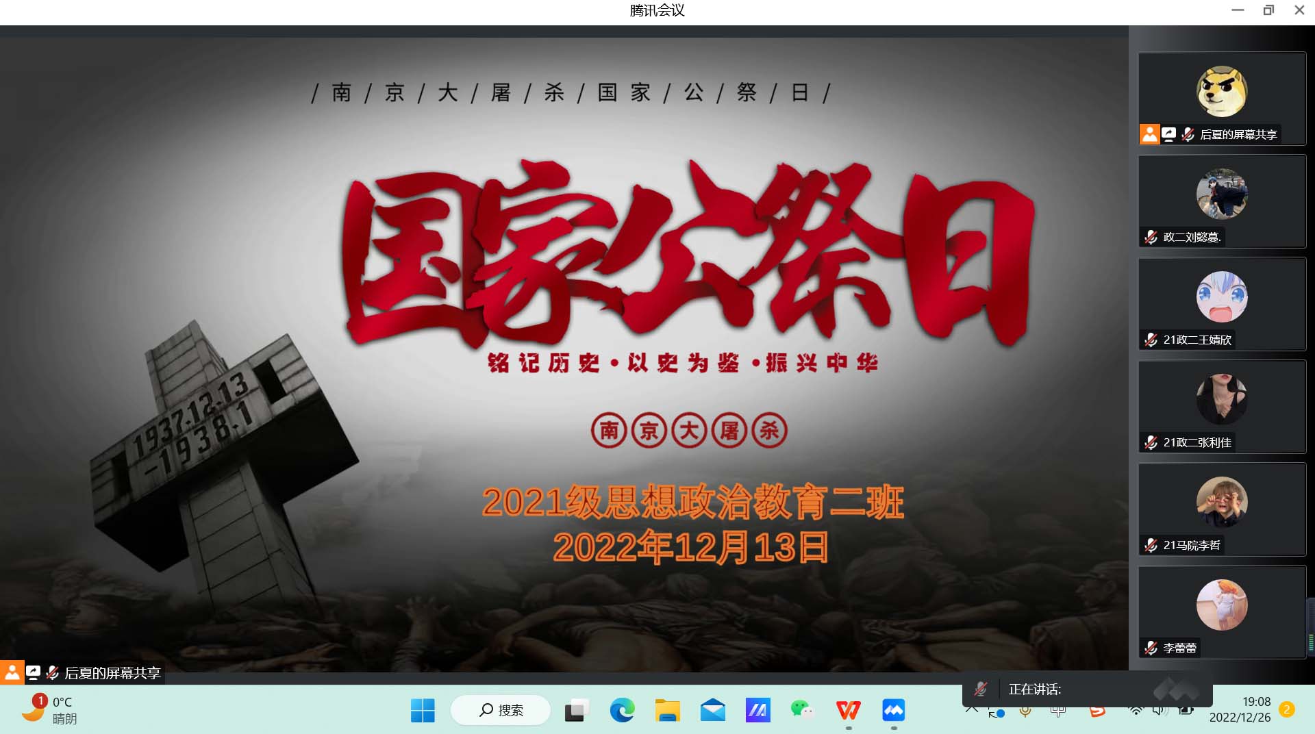 12月13日下午,太阳集团tyc59972021级思想政治教育二班在腾讯会议召开“铭记历史·以史为鉴·振兴中华”国家公祭日主题班会。2021级思想政治教育二班全体成员共同参加此次班会。班会由团支书王婧欣主持。