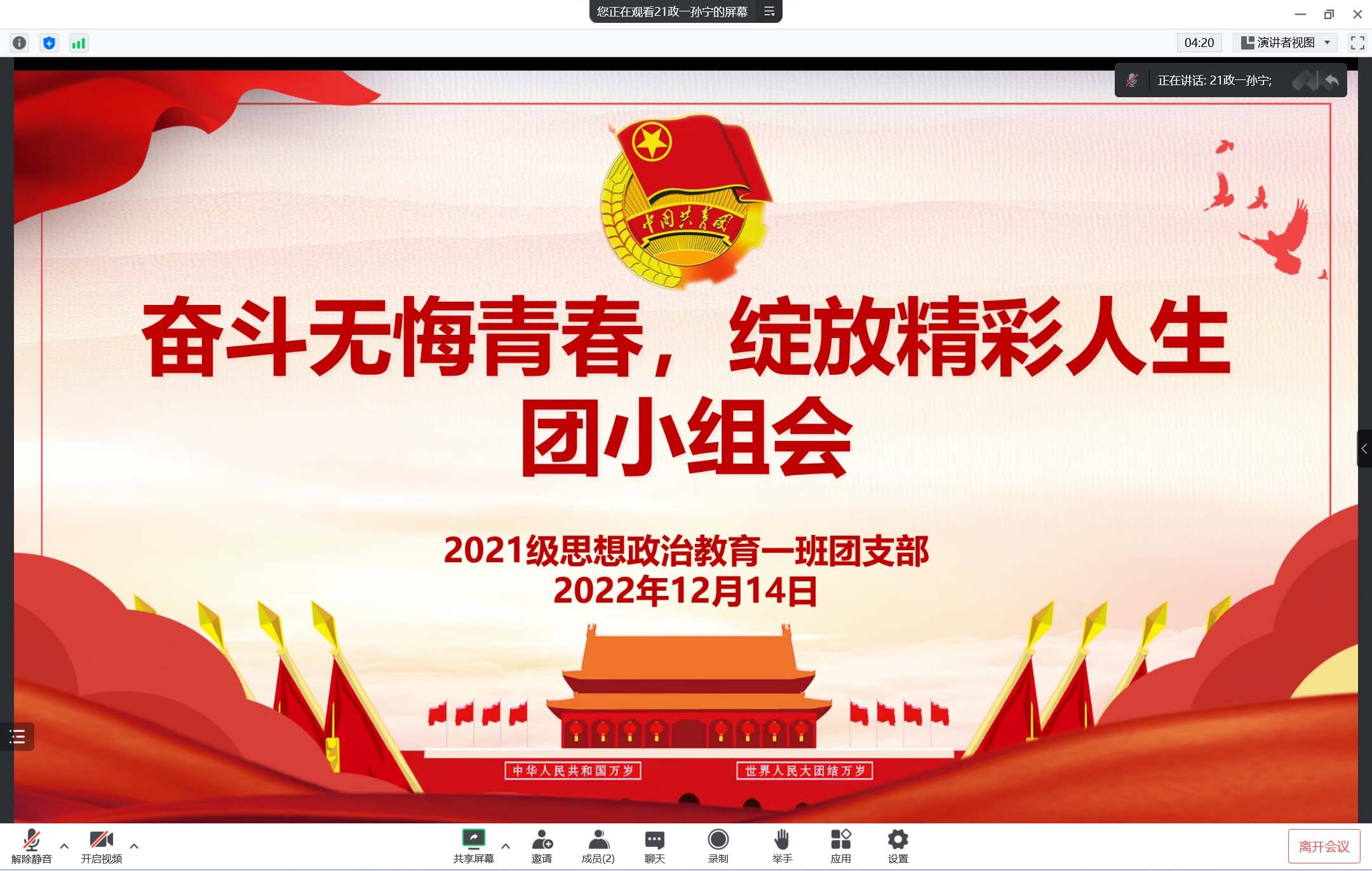 为激励当代青年们开拓创新、分秒必争、奋勇拼搏,12月14日下午,太阳集团tyc59972021级思想政治教育一班团支部第二团小组在腾讯会议召开线上“奋斗无悔青春,绽放精彩人生”团小组会。2021级思想政治教育一班团支部第二团小组全体成员共同参加了本次会议。会议由第二团小组组长孙宁主持。