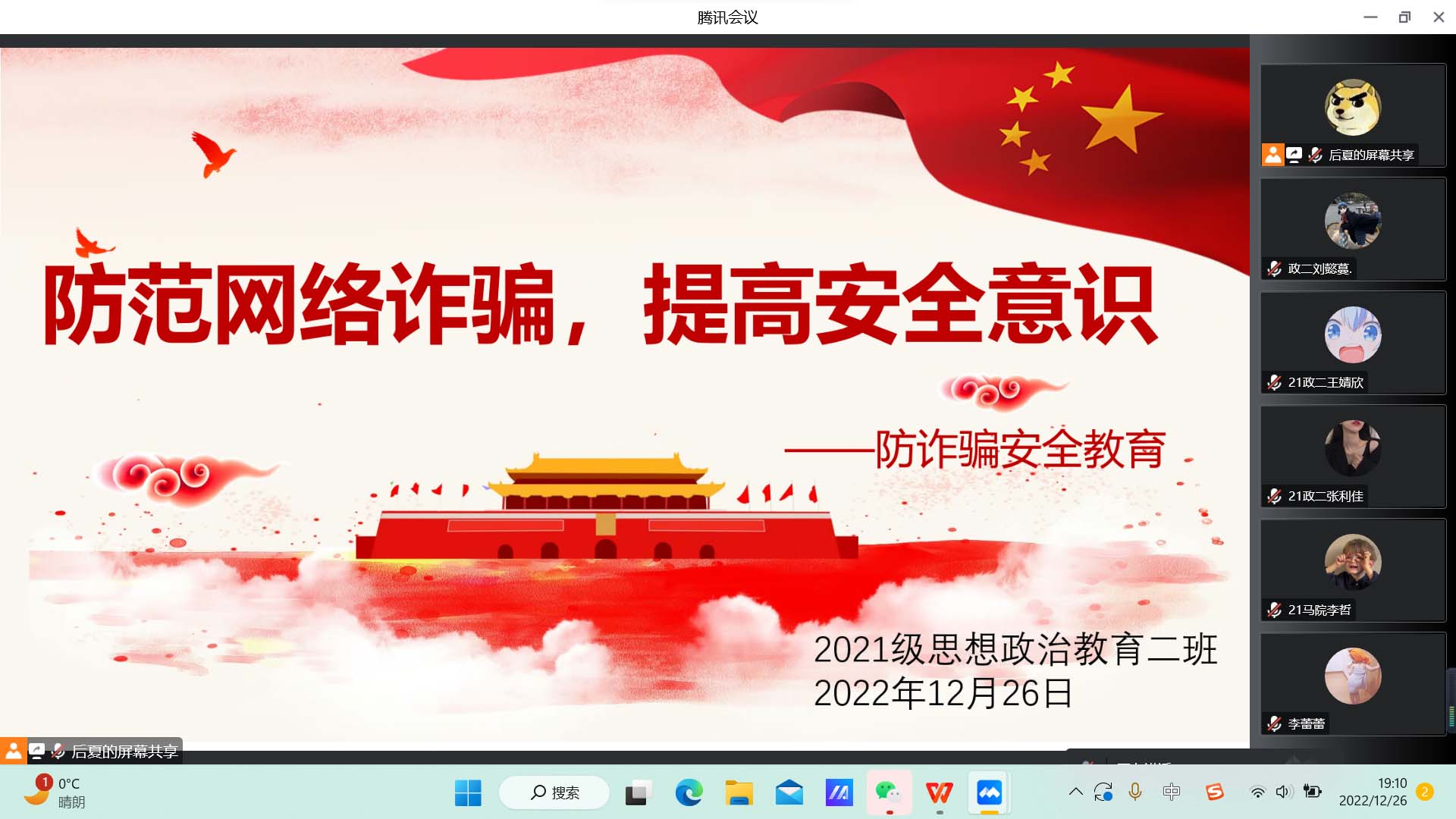 12月26日下午,太阳集团tyc59972021级思想政治教育二班在腾讯会议召开“防范网络诈骗,提高安全意识”防诈骗安全教育主题班会。2021级思想政治教育二班全体成员共同参加此次班会。班会由副班长任振豪主持。
