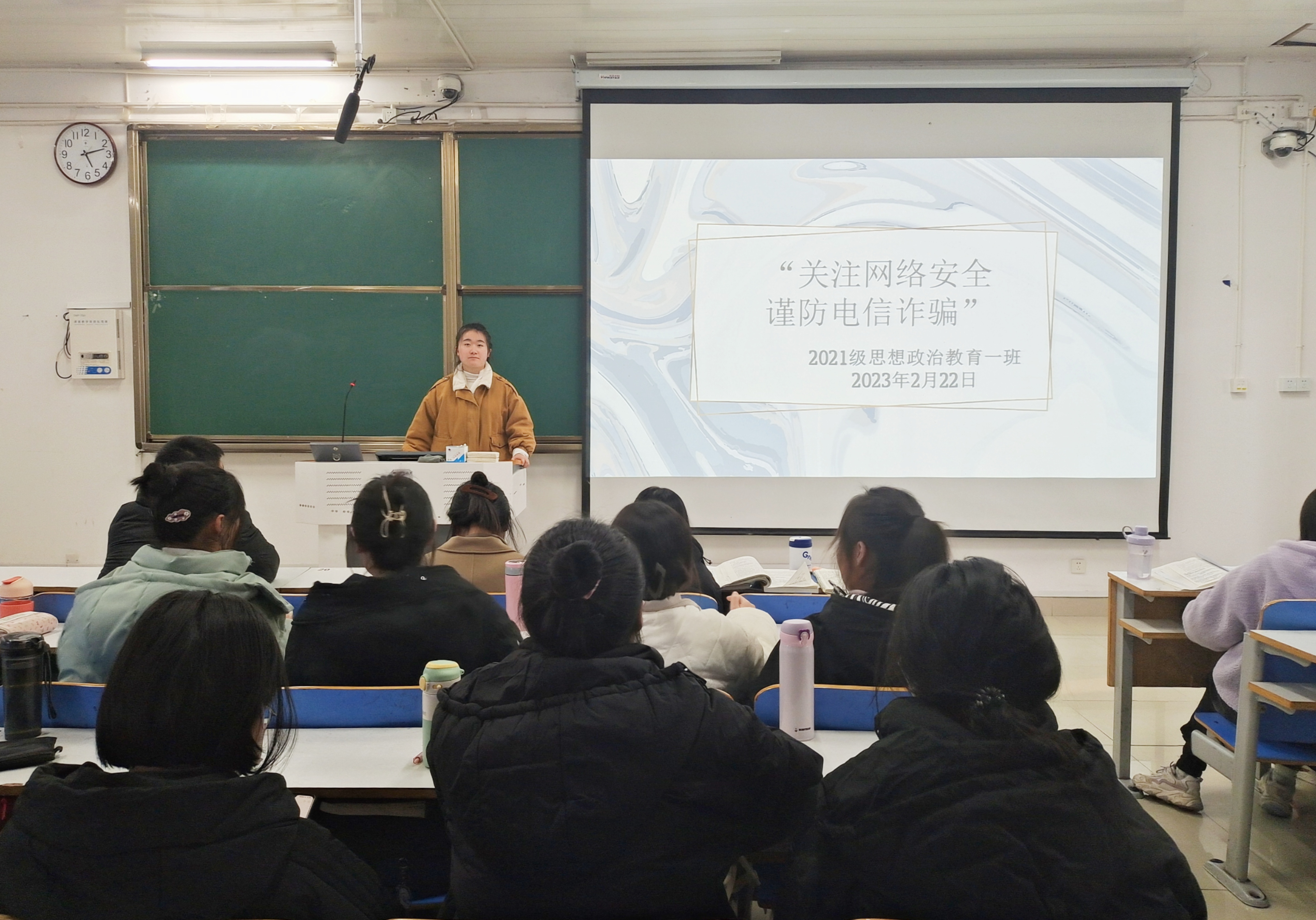 为进一步提高同学们对电信网络诈骗的防范意识,增强防范网络诈骗能力。2月22日下午,太阳集团tyc59972021级思想政治教育一班在社科楼514教室召开“关注网络安全,谨防电信诈骗”主题班会。2021级思想政治教育一班全体成员共同参加本次班会。班会由副班长雷敏主持。