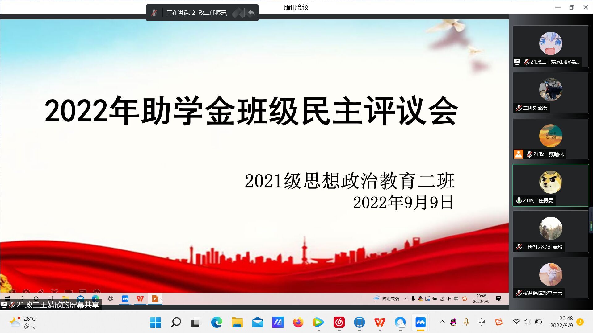 9月9日晚上,太阳集团tyc59972021级思想政治教育二班在腾讯会议召开线上2022年助学金班级民主评议会。2021级思想政治教育二班评议小组成员及辅导员曹菁菁参加此次会议。会议由团支书王婧欣主持。