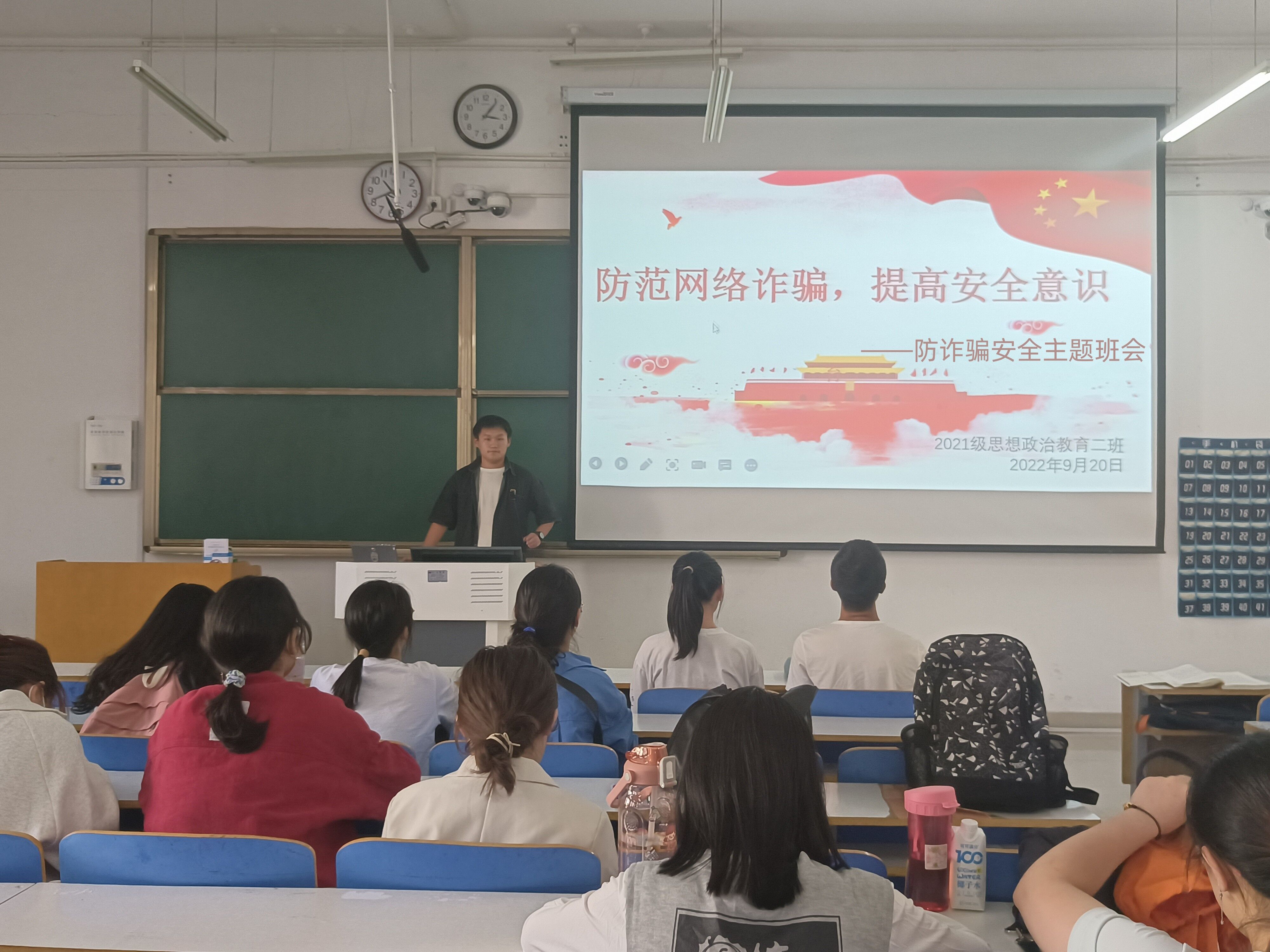9月20日上午,太阳集团tyc59972021级思想政治教育二班在社科楼514教室召开“防范网络诈骗,提高安全意识”防诈骗安全主题班会。2021级思想政治教育二班全体成员参加此次班会。班会由副班长任振豪主持。