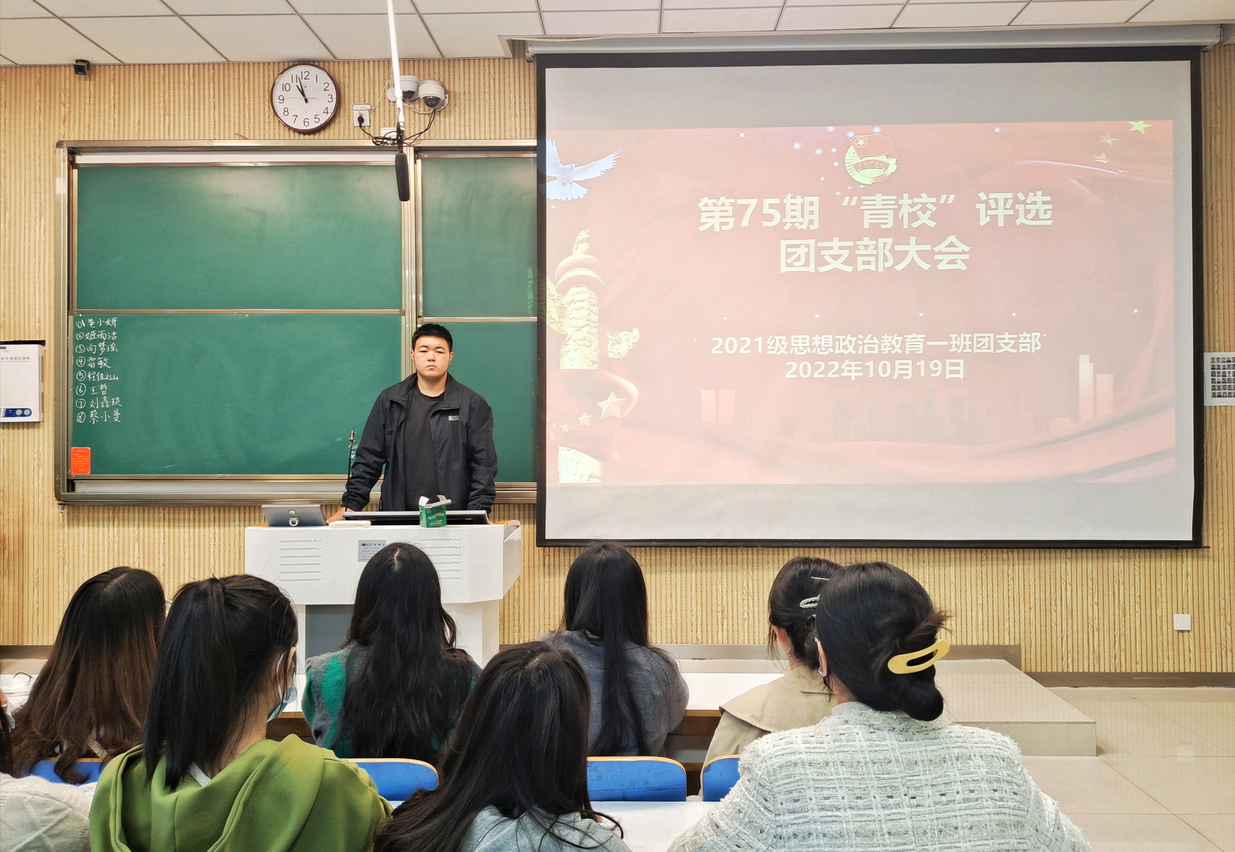 10月19日下午,太阳集团tyc59972021级思想政治教育一班在社科楼515教室召开第75期“青校”评选团支部大会。2021级思想政治教育一班全体团员共同参加了本次会议。会议由团支书戴翰林主持。