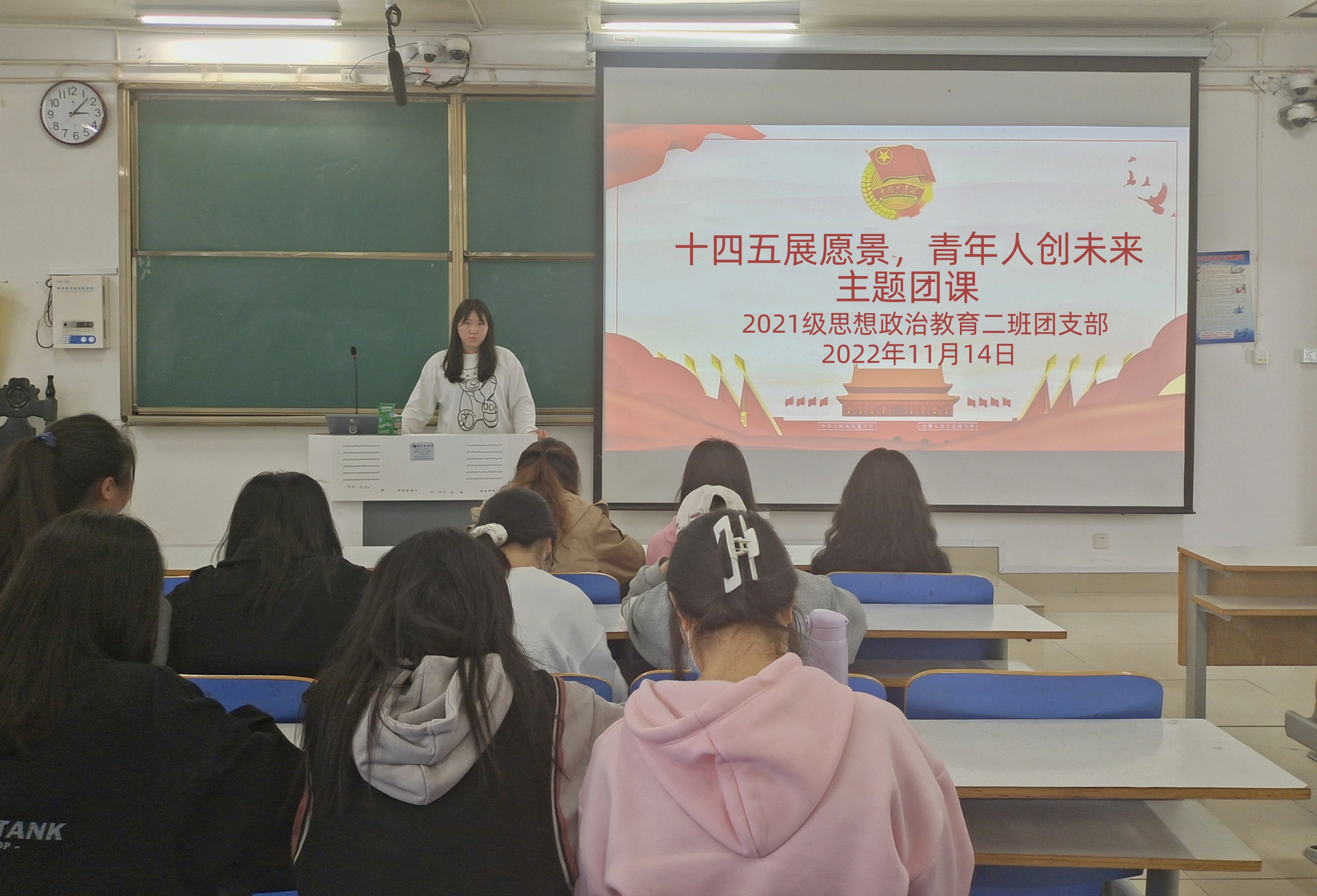 11月14日下午,太阳集团tyc59972021级思想政治教育二班在社科楼514教室召开“十四五展愿景,青年人创未来”主题团课。2021级思想政治教育二班全体成员共同参加本次主题团课。团课由团支书王婧欣主持。