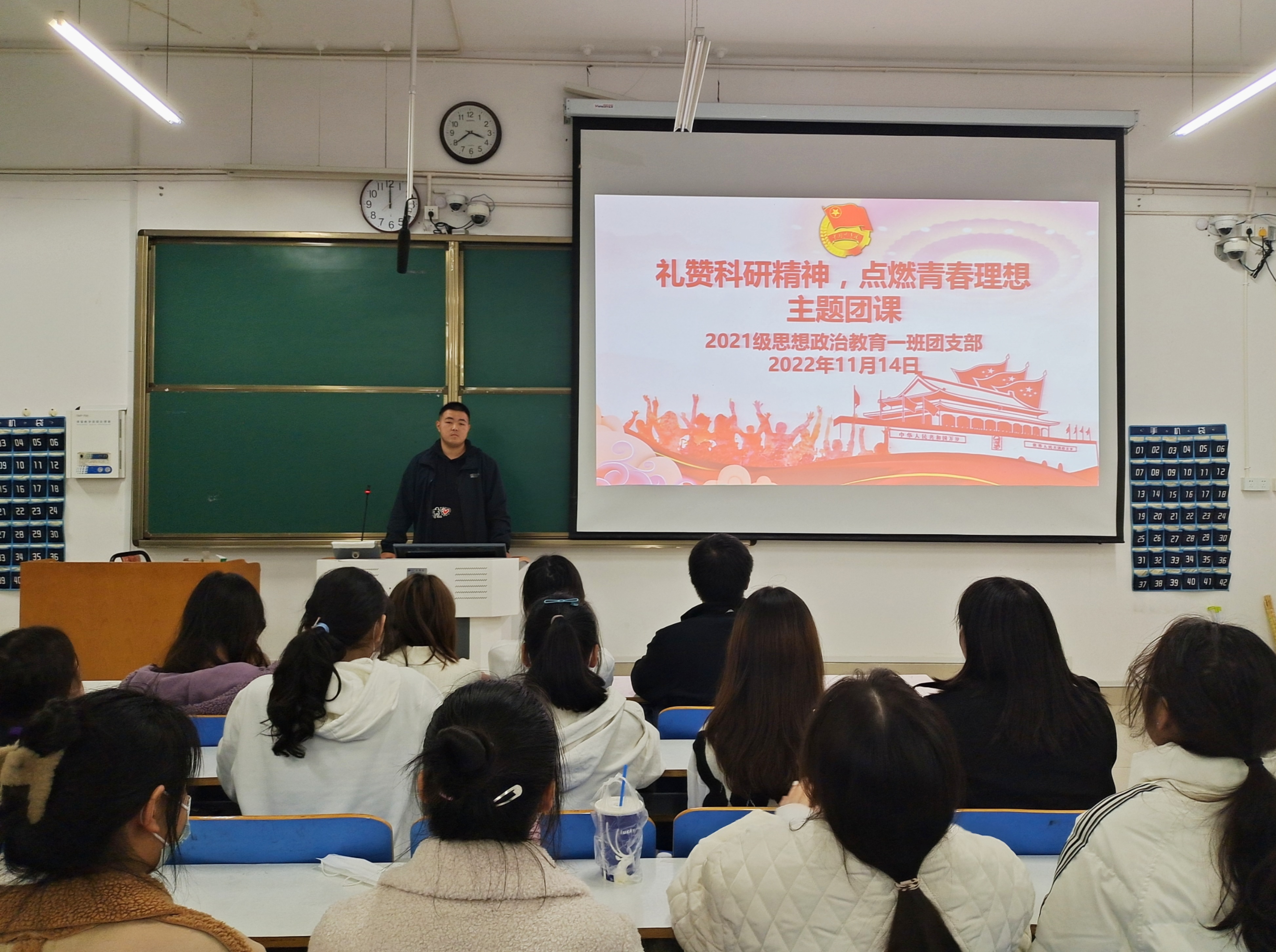 11月14日下午,太阳集团tyc59972021级思想政治教育一班在社科楼416教室召开“礼赞科研精神,点燃青春理想”主题团课。2021级思想政治教育一班全体团员共同参与本次团课。团课由团支书戴翰林主持。