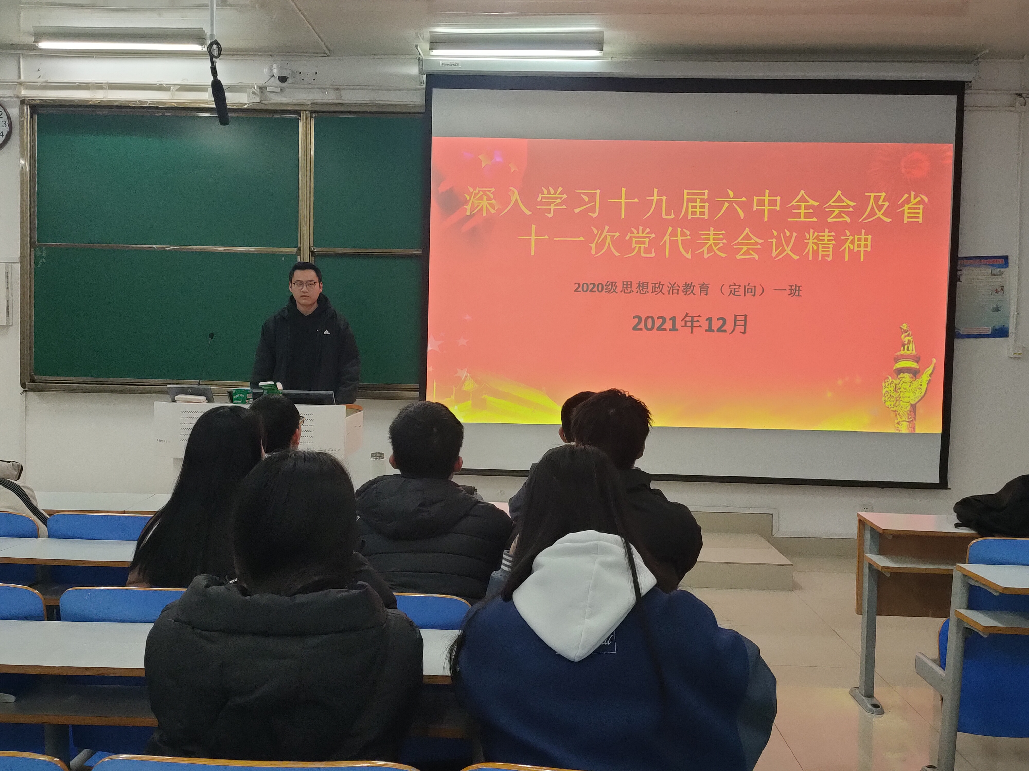 12月5日下午,太阳集团tyc59972020级思想政治教育定向一班团支部在社科楼514教室举办了深入学习党的十九届六中全会及省第十一次党代会精神主题团课。太阳集团tyc59972020级思想政治教育定向一班团支部全体成员参与了本次团课。