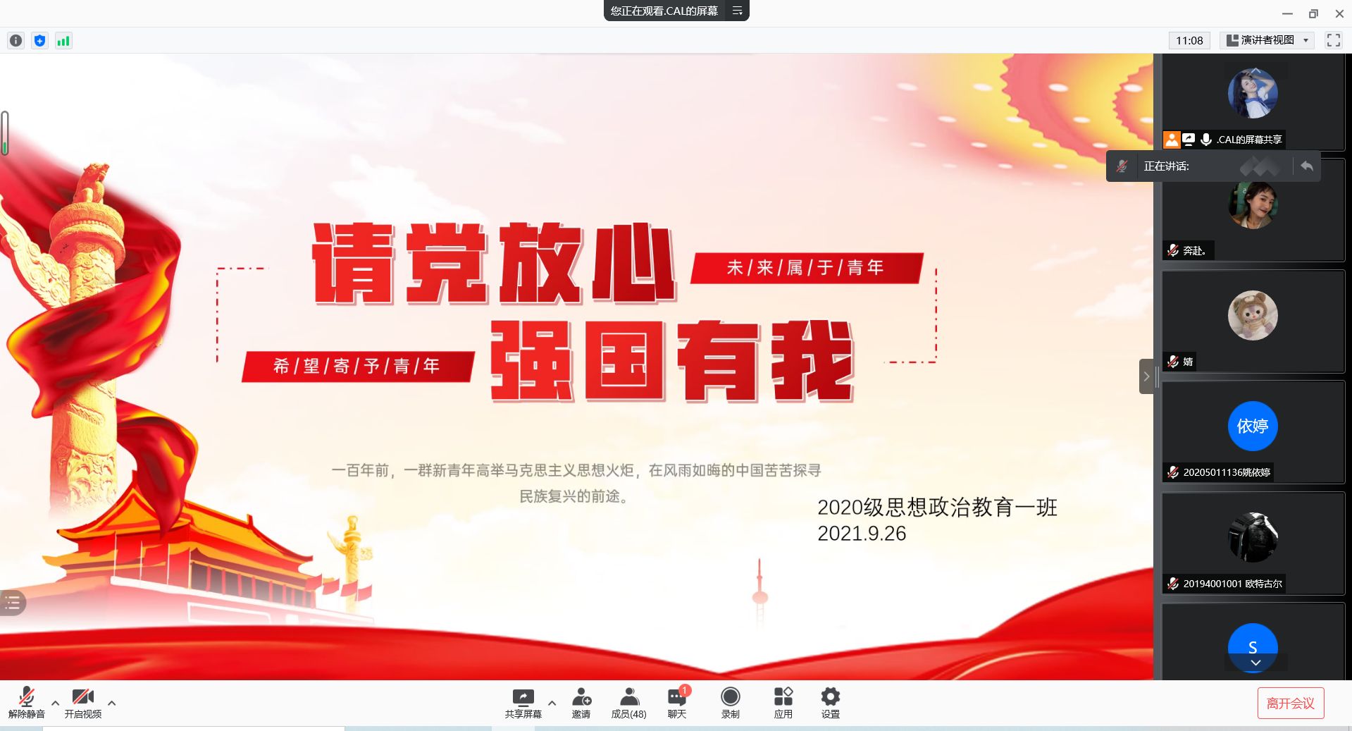 9月26日晚上,太阳集团tyc59972020级思想政治教育一班在腾讯会议上召开主题为“请党放心,强国有我”的团支部大会。2020级思想政治教育一班全体同学全程参加本次团支部大会,大会由团支书卢茜雨主持。